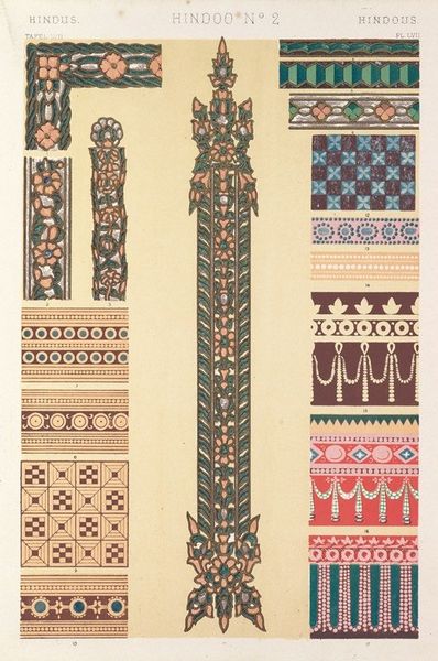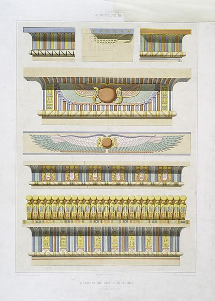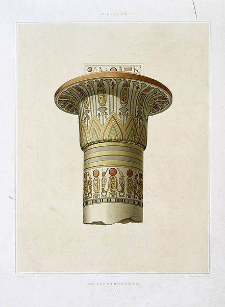 Owen Jones made this chromolithograph of Egyptian column capitals, or the tops of columns, at some point during his career as an architect, designer, and theorist of color. As one of the leaders of the British Design Reform movement, Jones was preoccupied with establishing a new kind of design aesthetic in the mid-19th century. In the mid-1850s, Jones published his most famous and influential book, "The Grammar of Ornament", filled with colorful illustrations, such as this one. Jones believed in the power of decoration to improve society and bring beauty into everyday life. In the book, he argues that ornament should be derived from nature but also be stylized and adapted to the materials and techniques of production. By studying historical examples like these Egyptian columns, designers and manufacturers could create objects that were both functional and beautiful. Jones’ approach to design combined historical research with a utopian vision for a more aesthetically pleasing society. His legacy can be found in museums, design schools, and the wider culture of visual taste.