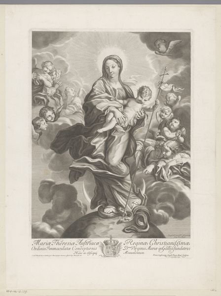 This engraving, "Destroy the dragon without sword; (Dan. 14.25); Virgin and Child on hemisphere" was created by Johann Jakob Frey the Elder. The print presents a captivating vision of the Virgin Mary and Christ Child, elevated above the world atop a celestial sphere. Consider how the composition is structured: Mary, the focal point, stands gracefully with the child, dominating the upper portion. The use of light and shadow emphasizes the textures of drapery and the softness of skin, while the surrounding cherubs create a dynamic, heavenly atmosphere. The image's semiotic power resides in its manipulation of religious symbols. The dragon, representing evil, lies vanquished beneath Mary's feet, yet, notably, without the need for a sword. This visual statement challenges traditional representations of power, suggesting divine authority transcends physical force. It is a visual statement, informed by religious philosophy, on the triumph of the spiritual.
