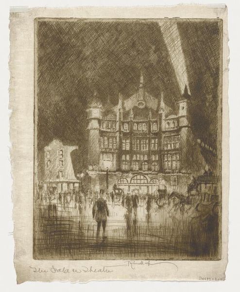 Curator: We are standing before "Straat te Delft met het stadhuis" by Willem Adrianus Grondhout. Executed in pen and ink between 1888 and 1931, this drawing offers a snapshot of daily life in Delft, showcasing the iconic stadhuis. Editor: The monochrome palette immediately gives me a sense of faded memory, a time capsule of sorts. It’s haunting, almost like a ghost imprint of a once-bustling street scene. Curator: Grondhout's choice of a stark medium like pen and ink certainly contributes to this effect. Delft, historically known for its ties to the Dutch East India Company, and its pivotal role in the burgeoning merchant class of the time, has always been a hotbed of socio-political tension in The Netherlands. Editor: Absolutely. Beyond the documented socio-economics, the towering stadhuis becomes a symbol of civic power and identity for the inhabitants. Notice how the buildings lean towards it, framing it not only architecturally but also ideologically. Curator: Precisely! And look at the people – they are depicted with incredible attention to detail, suggesting an emphasis on both the individual and the collective experiences. Are they representative of the intersectionality within the social stratification that prevailed? One must consider how economic opportunities would have shaped access, mobility, and even visibility for different groups in that specific urban setting. Editor: The pen-work carries psychological weight, a quiet observation with the use of symbolism of Delft and its architectural history as symbols. The street and the church evoke a timeless dialogue about community, its foundation of strength and faith through the years. Curator: Reflecting on Grondhout's work, I am struck by the way he uses everyday subject matter to offer broader commentaries. This simple street scene provides an access point into critical discourses regarding the social, political, and economic climates that shaped the history of the Netherlands. Editor: For me, it leaves me pondering how, despite time’s relentless march, symbols can maintain and continue to evoke echoes of societal experiences, binding us to our shared past in ways both seen and unseen.