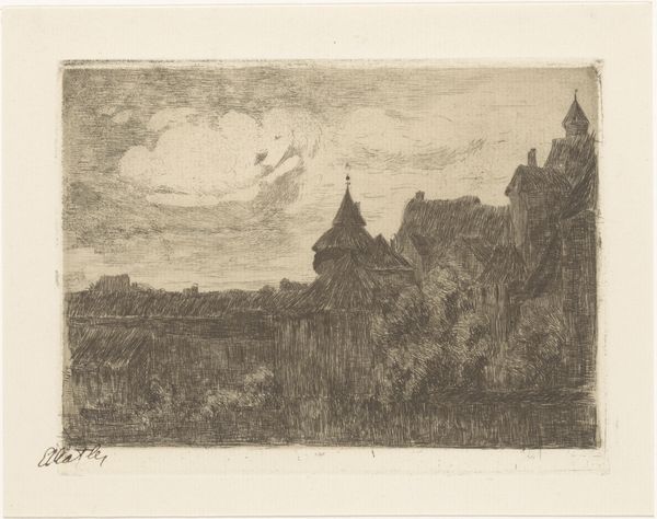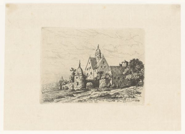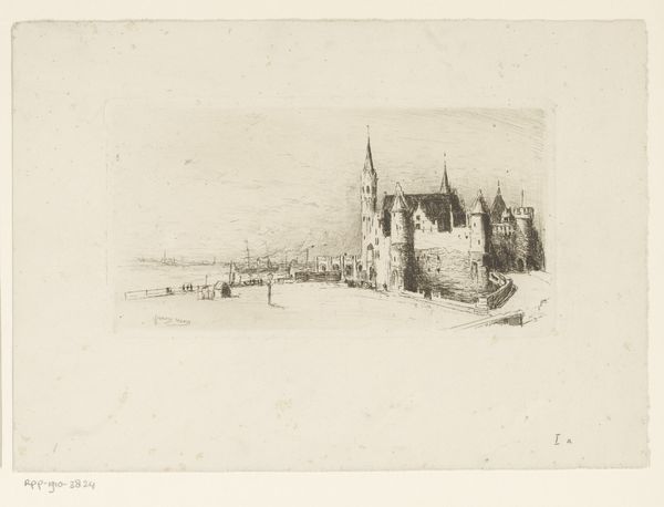 Anthonie Waterloo created this etching of a building with pointed towers on the water in the 17th century. The composition is dominated by linear elements, with fine strokes defining the architectural structure and the rippling water. The contrast between the detailed foreground and the softer, atmospheric background creates a sense of depth. Notice how Waterloo uses line and form to convey both the solidity of the building and the fluidity of the water and sky. The etching technique itself plays a crucial role; the fine, precise lines allow for intricate detail, while the varying densities of marks create tonal variations that suggest light and shadow. The building with pointed towers on the water becomes a semiotic marker, laden with cultural associations of stability and the sublime. This work invites us to consider how simple lines can construct complex meanings, reflecting a broader artistic concern with perception and representation.