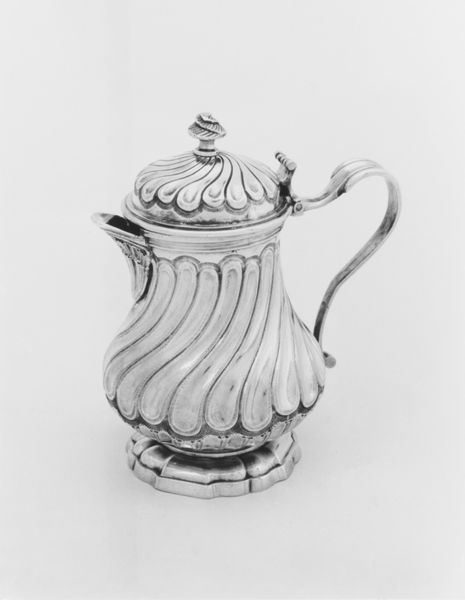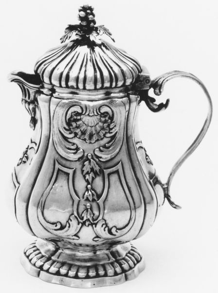 Curator: We're looking at a delightful silver mustard pot, crafted by Ennemond Ruynat sometime between 1753 and 1754. It's a Rococo piece, currently held at the Metropolitan Museum of Art. Editor: The immediate impression is one of luxury, a kind of contained opulence. The reflective surface and ornate detailing are so tactile. Curator: It's really the technique that strikes me. Silverwork like this demanded immense skill, a real command of the material. Think of the labour hours to chase and emboss these swirling flutes. The pot speaks to the hierarchical world of guilds and apprenticeships. Who was consuming mustard from such a vessel and what social performances was it a part of? Editor: The swirling form evokes the dynamics of growth and containment – very evocative of rococo themes. I can almost feel the pulse and surge of courtly life, its playful drama, echoed in this object. I find the details speak subtly about societal power structures. The teardrop embellishments along the upper rim look almost like inverted hearts, or tears held upside down. I would be really interested to explore what meanings a French nobleman might associate with that decorative device. Curator: Absolutely. It points to how objects weren't just functional but participated actively in constructing social identities. We see in that delicate finial, as well, a sort of excessive decoration typical of the period. It indicates consumption for display rather than merely utility, reflecting values attached to luxury and status. Editor: What’s fascinating to me is the way form becomes content. That repeated teardrop image seems an effort at masking deep human sentiments. This little pot, far from just a utilitarian container, becomes a vessel brimming with social and emotional implications. The object becomes a container for unspoken feelings, doesn’t it? Curator: I agree, in its essence, it shows how decorative arts like this embody labour and cultural meanings, demonstrating its integral position within broader social structures. Editor: For me, pondering these historical symbols is really about the relationship between design and human psychology across time. I wonder about its impact and significance to its original owner, beyond wealth. Curator: Looking closely really underlines the convergence of production and consumption; the making of such a thing is intertwined with social meanings of its consumption. Editor: Indeed; thanks, these are such good points to consider about the art of Ruynat, hopefully giving everyone food for thought!