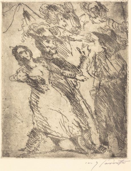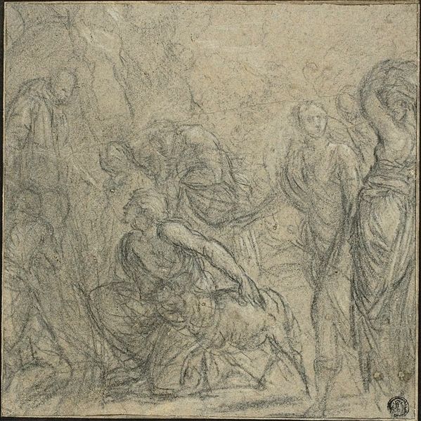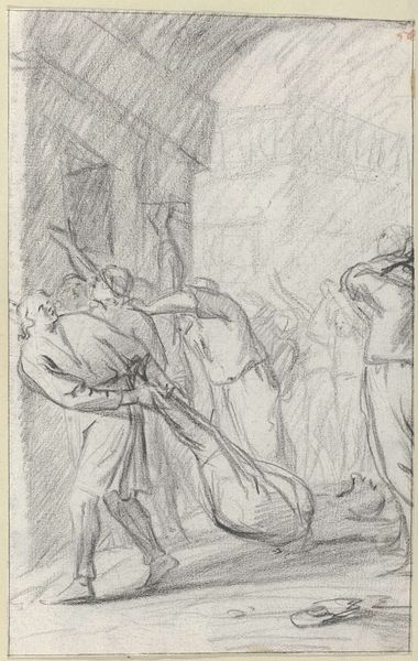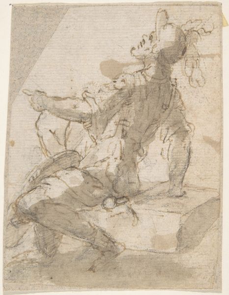 Editor: Here we have Francesco Solimena's "Study for the Death of Messalina," dating from the early 18th century. It’s a drawing, seemingly a preliminary sketch. There's so much frantic energy in the composition; what strikes me is the overt theatricality and violence. What is your interpretation? Curator: Considering Solimena's "Death of Messalina" within the historical context of Baroque art, we observe its role as a piece of political and social commentary veiled in historical drama. Messalina, the third wife of the Roman Emperor Claudius, was known for her alleged promiscuity and conspiracies. Editor: So, her death becomes a cautionary tale? Curator: Precisely. It reinforces social order through a display of the consequences of moral corruption and challenges to imperial power. Baroque art often served to uphold the authority of institutions, whether the church or the state. Think of how depictions of women's bodies become sites of cultural debates about sin and punishment during that time. What do you make of its medium being a drawing, and its purpose being a study? Editor: It makes me think of the work's potential audience. Maybe only viewed within the artist's studio, or by patrons intimately involved with its commission? Did this allow Solimena more freedom of expression, outside the stricter expectations of a public-facing finished piece? Curator: That’s an astute observation. It highlights how the social function and reception of art are inextricably linked to its creation and exhibition. This also helps understand how Solimena maneuvered social constraints surrounding this controversial theme through history painting. Editor: That's insightful, viewing the artwork as actively shaped by societal forces rather than just passively reflecting history. Curator: Exactly. Considering that dynamic is key to understanding the depth and continued relevance of art across different periods.