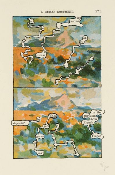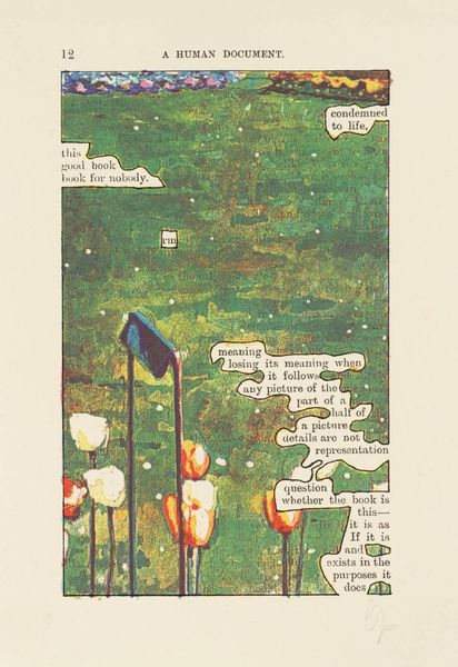 Curator: This piece by Esq Tom Phillips, currently held at the Tate, presents a visually striking amalgamation of text and image. My immediate reaction is that the colour palette feels rather unsettling, almost nightmarish. Editor: Phillips' work often draws on pre-existing texts, layering meaning through interventions, and I wonder what historical narratives or political arguments are at play in this image from "A Human Document." Curator: The phrases "obscure, monstrous" and "soul madness" combined with that stark red...it's emotionally charged, isn't it? And how does the language build on the image? Editor: The use of appropriated text also brings up questions of authorship and power dynamics, who gets to define "a human document," and from what perspective is it being presented? Curator: It’s a fascinating example of how art can be both deeply personal and politically engaged. Editor: Yes, I agree, it invites us to consider the cultural frameworks that shape our understanding of self and society.