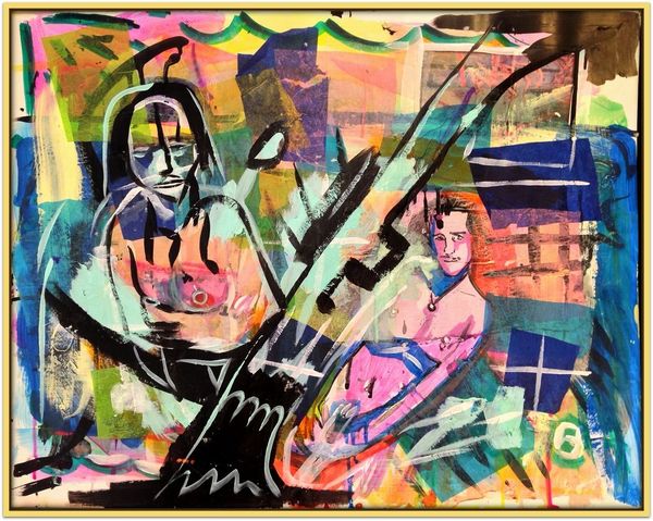 Editor: This is David Michael Hinnebusch’s mixed-media painting, “Idol Buzz,” created in 2017. There's a striking rawness to the work, a certain unrestrained energy in the application of paint. What do you make of it? Curator: Well, first off, that title "Idol Buzz" pulls us in. An idol, right? Immediately, that term vibrates with centuries of layered meaning. We think religious icons, objects of worship...but it's "buzz," not "hymn." It speaks to the hyper-charged atmosphere around celebrity today. Hinnebusch isn't just presenting figures; he is hinting that celebrity is the modern day’s idol worship. Don’t you agree? Editor: I do, it definitely comes through. The visual cacophony and kind of flattened space feels really contemporary, and lends the artwork that quality. How would you describe the symbolism? Curator: Think of graffiti art as today’s cave paintings: a direct link to basic desires and storytelling. The artist has integrated graffiti with an oil painting of an icon to create cultural continuity through his own language, connecting with contemporary ideas about sex, fame, artifice, the very concepts represented through icons throughout time. What do you see echoed in the images themselves? Editor: I see that there is some deliberate distortion of the human form and I think it evokes something about the potential dangers surrounding iconography itself and idol worship, in general, for both of them. The faces are obscured somewhat; the female is idealized with very pronounced eyelashes. Are these types meant to symbolize figures in modern popular culture? Curator: Exactly. It isn't necessarily about specific celebrities but types; ideas represented again and again in a kind of cultural memory loop. Recognizing and understanding symbols makes viewing artworks all that more interesting, wouldn't you say? Editor: Definitely. I’m walking away with a new way of framing continuity of image in time, it definitely gives one something to think about.