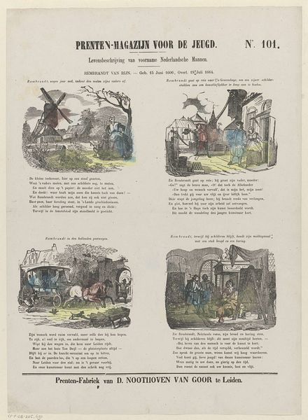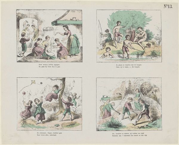 Dirk Noothoven van Goor's "Scènes uit het Oude Testament," a print from the Prenten-Fabriek, uses the relatively modern medium of commercial printing to depict biblical stories for a young audience. The print's appearance, with its simplified linework and limited color palette, reflects the industrial process used to create it. This was likely a cost-effective method, intended for mass production and widespread distribution. The relatively small scale suggests it may have been included in a book or magazine, reflective of a growing print culture, and expanding consumer marketplace. The work makes visible the division of labor inherent in mass production: from the artist who designed the image, to the technicians who transferred it to the printing plate, to the factory workers who operated the presses. Although not explicitly stated, the presence of the "Prenten-Fabriek" highlights the shift towards industrialized methods of production, reflecting broader social issues related to labor and consumption. Looking closely at this print, we can appreciate how materials, processes, and social context shape its meaning, bridging the gap between fine art and everyday life.