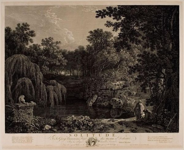 Curator: Before us, we have William Woollett's "Saint John and Magdalen." It’s a print, based on an original picture by Annibale Carracci. Editor: It's certainly evocative! I’m struck by the detail rendered through the engraving process. The contrast of light and dark creates a dramatic intensity. Curator: Absolutely. Prints like these were vital for disseminating imagery and styles widely. Consider the labor involved; the skilled hand cutting the lines into the copperplate. Editor: And the role of prints in circulating artistic ideas. How did this image of Saint John and Magdalen shape religious perception and devotion across different social strata? It clearly references idealized landscapes popular at the time. Curator: Precisely! The network of workshops, distributors, and consumers all influencing what becomes popular. Editor: It makes you wonder about the economics of faith, doesn’t it? Curator: Indeed. It is fascinating to think how the work was made and distributed, and the audiences it found. Editor: Yes, the image also takes on a different light when we view it as a historical artifact.