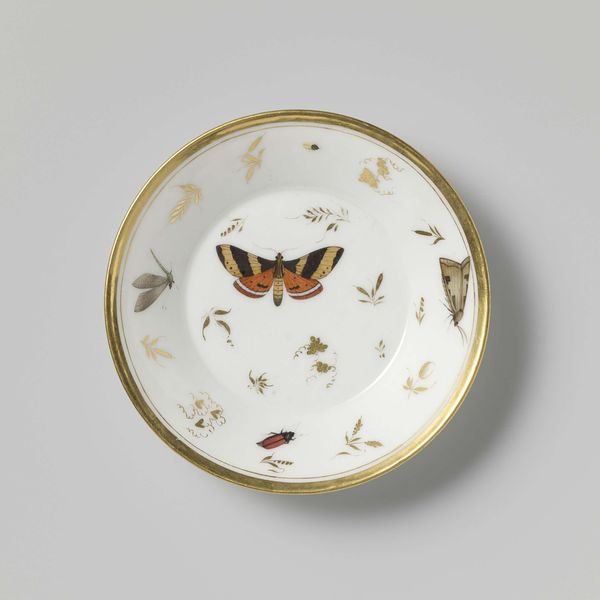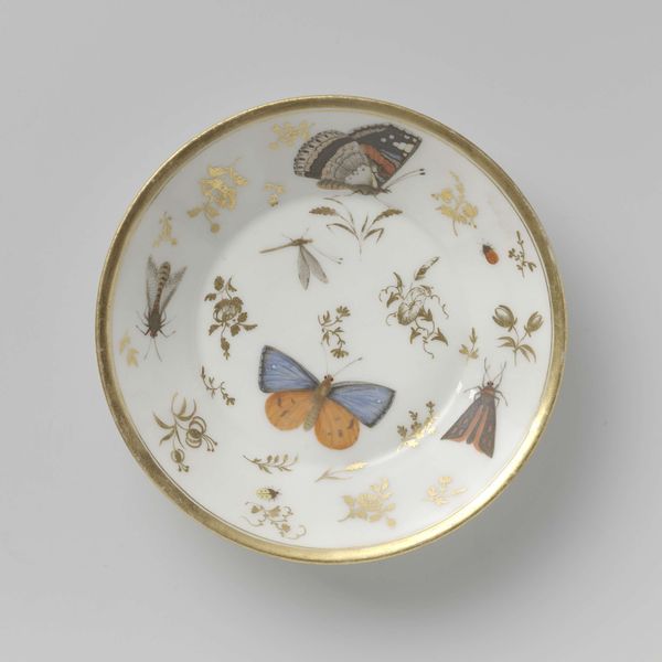 Curator: This object is a saucer, made around 1797 or 1798. It’s currently held at the Rijksmuseum. It’s decorated with watercolor and drawings to depict insects, flower sprays, and grapevines, on ceramic. Editor: My first thought is, it’s an incredibly delicate presentation of something many people find unpleasant. A fly rendered with this much precision—it almost elevates the insect. Curator: The elevation comes, in part, from porcelain’s long association with luxury and refinement. This isn’t just functional tableware; the insects act almost as emblems of nature tamed. Insects often represent transformation and the fleeting nature of life. Does the fly, for instance, stand for mortality and decay, or for something more positive? Editor: Or could it represent, simply, pest control? Serving something sweet with an image designed to drive insects away—that's some high-level craft. Who made this piece? It would be interesting to know more about the studio or factory involved and their material constraints. Curator: That context would be enlightening! Rue Thiroux in Paris produced these kinds of decorative pieces. Given that it’s the late 18th century, before true industrialization, even something mass-produced retains an artisanal aspect, with much human intervention in the process. It would speak to the democratization of such luxurious items. Editor: Exactly. And look at the labor. Imagine painting all these tiny details on such a curved surface with the limited tools and raw material of that era. Even the subtle variations in the gilding around the rim tell a story about craft. How much skill does this involve and how many steps are needed? Curator: I am most struck by how the piece reflects the human desire to organize and represent nature through images—almost claiming ownership over it by portraying it within such formal, constructed parameters. Editor: I agree. Looking beyond the symbolism, the material details offer insight into 18th-century production practices and consumer desires. Both layers—symbolic and material—reveal different values attributed to it and to what, and whom, it represents.