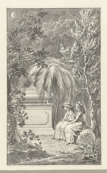 Editor: This is "Two Women at a Tomb in a Landscape at Night" by Harmanus Vinkeles, from 1787. It's an engraving, and the mood is really pensive, almost theatrical. The contrast between light and shadow is so dramatic. What’s your take on this scene? Curator: Well, it whispers to me of Neoclassical sensibilities draped in the Romantic era's twilight. Look how meticulously Vinkeles uses line, creating a scene that feels both staged and intimate. Nighttime landscapes often served as backdrops for reflection, journeys into the soul, if you will. These women—what do you think they represent? Is it grief? Contemplation? Or perhaps a blend of both? Editor: I was thinking grief, definitely. Maybe they're sisters visiting the grave of a loved one. Curator: Perhaps. And consider the tomb itself - a classical structure softened by the weeping willow. Vinkeles masterfully marries structure and emotion. It feels almost as if he’s posing a question, doesn’t it? What solace do we find in beauty when confronted by mortality? Editor: That’s a really interesting way to look at it. The beauty of the scene almost contrasts *too* much with the sadness. It’s thought-provoking! Curator: Exactly! It's that very tension, the push and pull, that makes the piece resonate even now, centuries later. Beauty, melancholy...perhaps they are just two sides of the same coin? It reminds me of something… ah yes. “We look before and after, and pine for what is not.” Don’t you think Vinkeles evokes just that sentiment here? Editor: Definitely. I hadn't thought about it that way, but now I see it. Thanks for sharing your perspective. Curator: My pleasure! And thank *you* for bringing such fresh eyes to this little gem. It is nice to ponder, isn’t it?