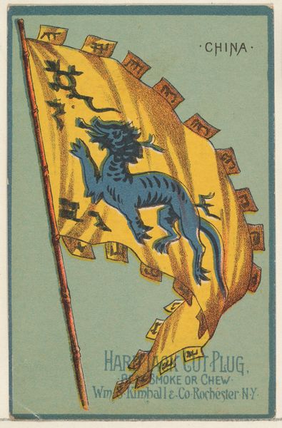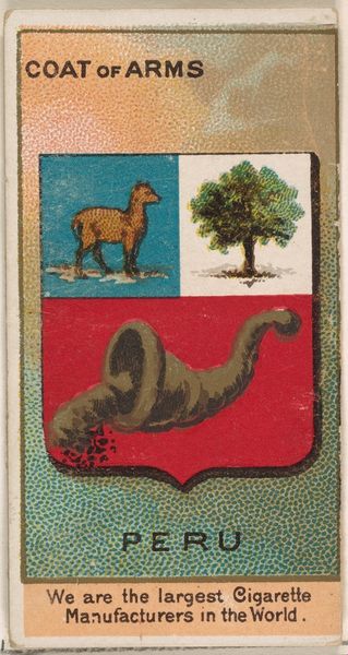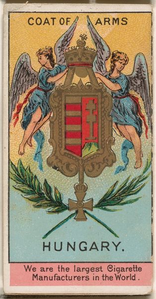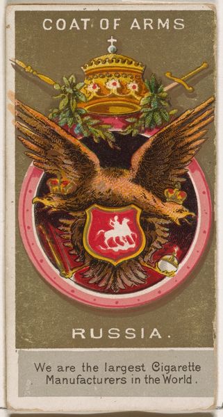 Curator: Here we have a piece from 1888, "Charles I, King of Würtemberg," part of the "Rulers, Flags, and Coats of Arms" series by W. Duke, Sons & Co. It’s a coloured-pencil print—a curious intersection of commercial and decorative art. Editor: First impression? That is surprisingly intense, almost aggressive for something so small and decorative. It feels like power condensed, a tiny explosion of heraldic imagery. Curator: Precisely. Let’s consider the composition. The heraldic crest, rendered with an almost obsessive level of detail for something designed to sell cigarettes, commands the eye. Note the bilateral symmetry, anchoring the design—lion and stag flanking the central shield. Editor: It’s funny, those creatures look so angry. The lion, the stag... both poised, ready to pounce or run. It's more "Game of Thrones" than "cigarette break," wouldn’t you agree? The decorative scrollwork frames that aggression. It’s trying to domesticate the raw power. Curator: A fascinating tension. The limited color palette—predominantly reds, greens, and golds—contributes to the overall impact. Note how those saturated tones draw your attention, even from across a room, creating an image with depth, in the limited area, despite the flattened space and limited modelling. Editor: And then there's the text. "Furchtlos und treu"—fearless and loyal—emblazoned across the scroll. It really does amplify that sense of grim determination. Plus, that little cross! All that moral virtue crammed into a single cigarette card. I can't help but wonder what Charles I of Würtemberg himself would've thought! Curator: I think he would appreciate its attempt to translate power into symbol. Editor: Absolutely. So much concentrated identity within the design. It’s interesting that something intended to sell cigarettes became a tiny piece of history. Curator: And a demonstration of enduring visual rhetoric, of course.