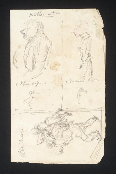 Curator: This pencil drawing, created around 1660 by Moses ter Borch, is entitled "Two Women's Heads and a Portrait of Gerard ter Borch the Elder." Editor: The arrangement immediately strikes me; the somber faces, framed in gray and balanced on either side of a livelier portrait in the center, create a rather compelling visual rhythm. Curator: I agree, and it's tempting to consider how these portrayals might reflect the societal positions afforded to the women versus the elder ter Borch during the Dutch Golden Age. The women seem constrained, almost cloistered, while the man exudes a confidence possibly granted by his gender and professional status. Editor: True, but consider the stark contrasts achieved solely through the variation of line work; the rough hatching around the central portrait compared to the gentle shading used for the women, suggests a deeper psychological study through purely formal means. The textures become symbolic in their own right. Curator: And that's fascinating, particularly when viewed through the lens of class. Perhaps this difference in textural representation mirrors class-based visual tropes prevalent in art meant for public display or familial legacy, versus intimate drawings meant for more private viewings. Editor: It's certainly possible. What about the compositional aspects themselves? Note how the Elder is presented in profile while the women look out at us; this lends the women some amount of agency. Curator: An agency undermined, I might add, by their garb. The veils almost seem designed to obfuscate and subdue their presence, a potent reminder of the limitations placed upon women. I believe this is especially poignant, even if only a subconscious, effect that the artist has generated. Editor: Perhaps. But either way, the piece generates a remarkable play of lines. Thanks to Borch's attention to formal values, these simple portraits have lasting expressive appeal. Curator: Precisely, and when read together these portraits also generate a great insight into Dutch Golden Age sensibilities. This piece allows a contemporary audience a complex glimpse at both social and aesthetic standards.