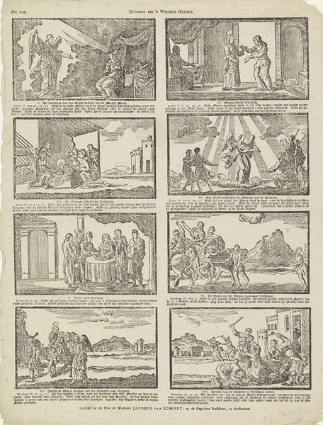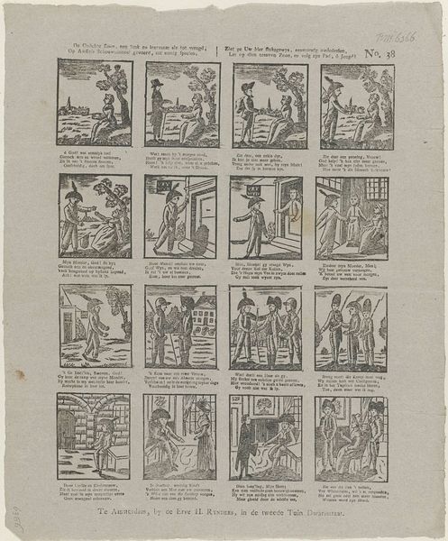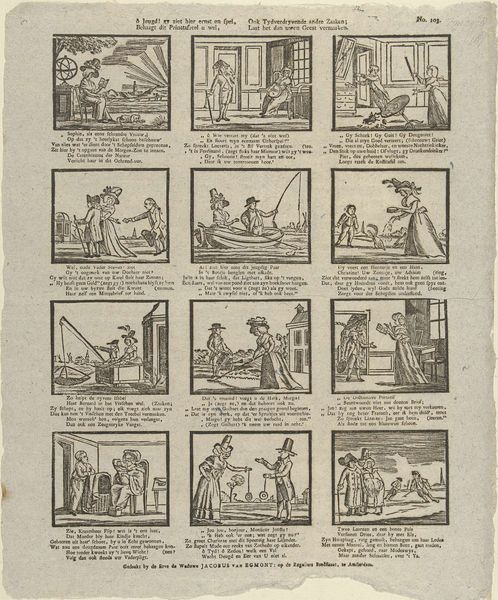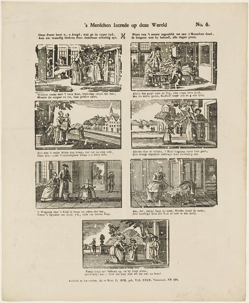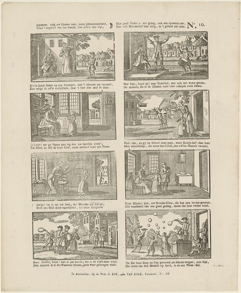 This undated print, made by weduwe C. Kok-van Kolm, visualizes the different stages of childhood. The work presents a series of vignettes, each accompanied by a descriptive verse. The images evoke a sentimental view of childhood, yet hints of the social and moral expectations placed upon children are also visible. Scenes range from parental care to religious instruction, revealing the complex roles children were expected to fulfill in 18th-century Dutch society. Consider the artist's position as a widow managing a printmaking business. Her personal experiences likely shaped her perspective on family and childhood, influencing the themes and emotions conveyed in the artwork. The verses accompanying each scene emphasize obedience, piety, and diligence, reinforcing the values that were crucial for children growing up in this era. Although seemingly simple, this print offers insight into the intertwined ideals, responsibilities, and emotional landscapes of childhood, subtly reflecting the societal norms of its time.
