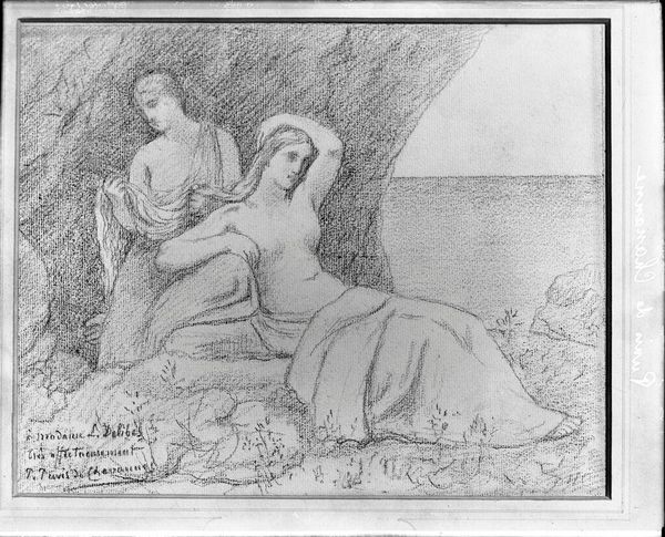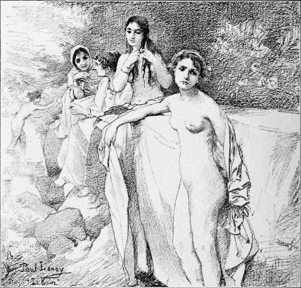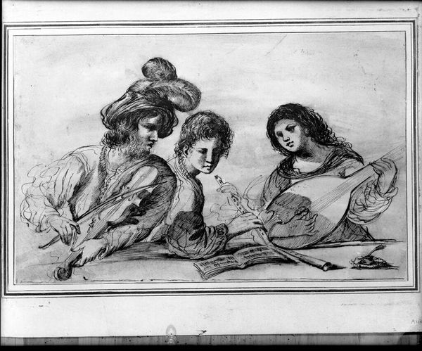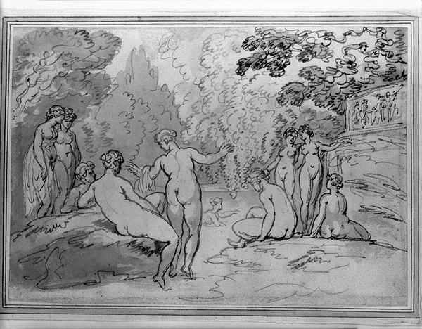 Curator: This is "Diana and Two Nymphs Bathing," a work by an imitator of Guercino, housed here at the Harvard Art Museums. The etching offers a glimpse into a classical scene. Editor: It strikes me as contemplative. The figures are caught in a private moment, yet their gaze hints at something beyond the immediate setting. Curator: The image certainly draws on established iconography, but within its historical context, we must consider how such depictions of female nudes reinforced societal power structures and assumptions about gender and sexuality. Editor: True. How the act of observing, even in art, can be fraught with power dynamics. But I also see the figures as strong, self-possessed women. Curator: Perhaps it's a reminder of the enduring tension between artistic representation and lived reality. Editor: Exactly, and that’s something to consider when viewing this image. Curator: Indeed, thank you for unpacking that. Editor: My pleasure!
