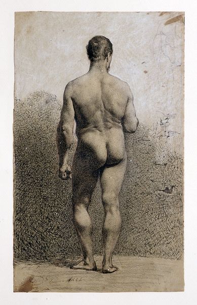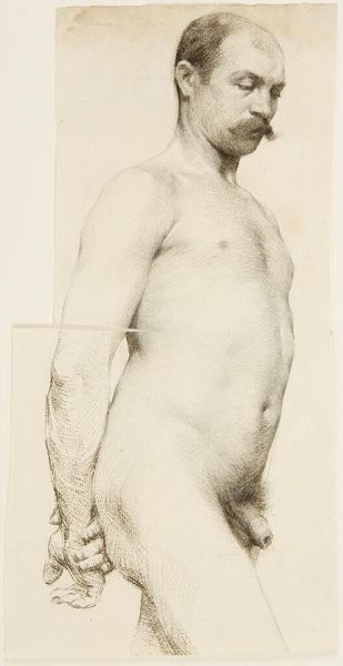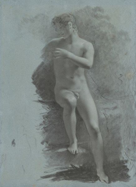 Curator: We're looking at Daniel Huntington's "Seated Male Nude," created in 1838. The artwork, residing here at the Metropolitan Museum of Art, is rendered in charcoal and graphite. Editor: Oh, wow. There’s something vulnerable and fleeting about it. The light seems to be consuming the figure. It looks less like a definitive study of the body and more like an impression of its presence. Curator: Exactly. It's an academic study, meant for practice and learning. These nudes were common in art academies, emphasizing anatomical precision, idealized form, and, of course, a mastery of light and shadow. The use of charcoal and graphite allows for subtle gradations that mimic the softness of flesh. Editor: I notice the line work. It's tentative. Like the artist is thinking aloud onto the page, erasing and rethinking forms as he goes. Also the muted palette creates this beautifully haunting feeling. It doesn’t feel neoclassical or overly formal. Curator: You're spot on. While fitting into the academic tradition, it has hints of realism and even romanticism seeping through. The slightly awkward, less idealized pose and the focus on subtle tonal variations gives it that more human quality. Editor: His posture suggests a kind of introspective mood. A heavy vulnerability in the slight slump of his shoulders and droop of his head. Maybe he knows he is being watched, but not considered. It makes you consider how often the models were included or dismissed as mere tools, you know? Curator: Absolutely. These figures rarely had agency in their portrayal and that becomes part of art history’s consideration of power. It reflects the societal dynamics inherent in the act of observing and representing the human form during this period. Editor: You look at him here and he could be in pain. Or bored. Or tired. A powerful combination for such a simple study. I might look at it for much longer, trying to unlock the feeling or find something in it I didn’t realize was inside myself. Curator: Well, thank you for these fresh insights, highlighting its nuances in capturing the transient beauty of the human form. Editor: My pleasure. Now I must find this drawing and find out how long I really will stare.