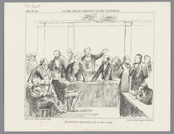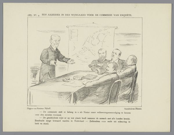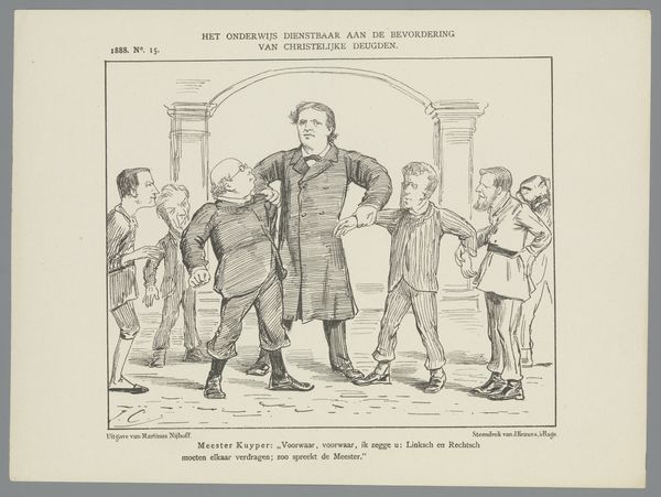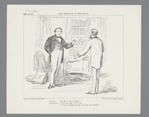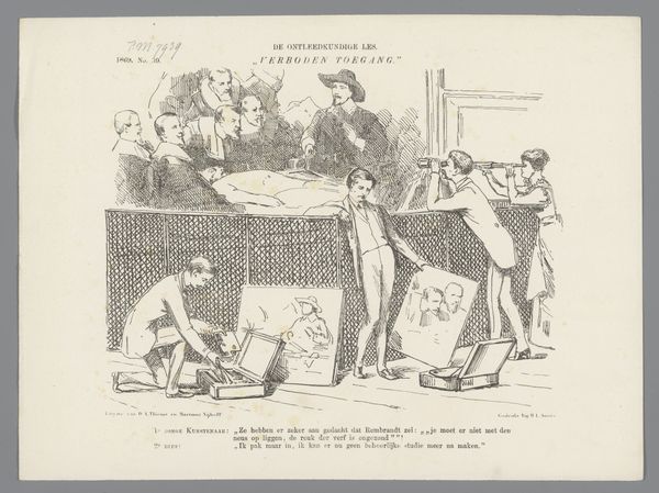 This print, titled "Spotprent," was created in 1878 by Johan Michaël Schmidt Crans. It’s a satirical illustration referencing a "magic comedy" called "From Amsterdam to Baghdad," a play in six scenes. The humor here seems rooted in societal critique. On the left, we see what appears to be a panel of critics or judges, perhaps representing the establishment or arbiters of taste. To the right stands a figure awkwardly attached to a stork, seemingly representing the playwright or perhaps the play itself. The stork is a metaphor, suggesting a clumsy or perhaps unnatural attempt at flight or fancy. The Dutch text beneath the image adds another layer. The figure laments that despite his attempts, he cannot play the fool, suggesting a struggle to entertain or perhaps a critique of the play's own shortcomings. It speaks to the tension between artistic ambition and public reception. Ultimately, the print invites us to reflect on the relationship between art, criticism, and the artist's struggle to find their place within a complex cultural landscape. It hints at the personal and emotional toll of artistic creation and the ever-present fear of failure or ridicule.