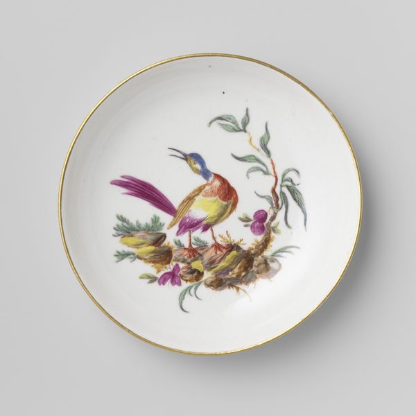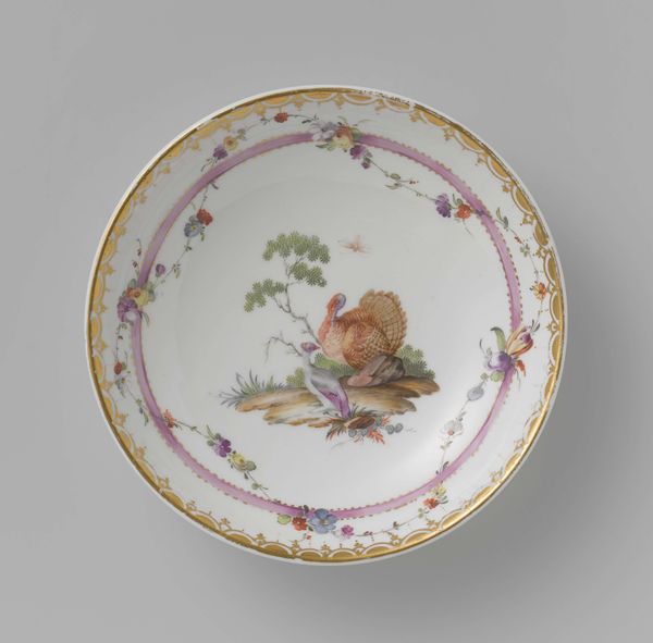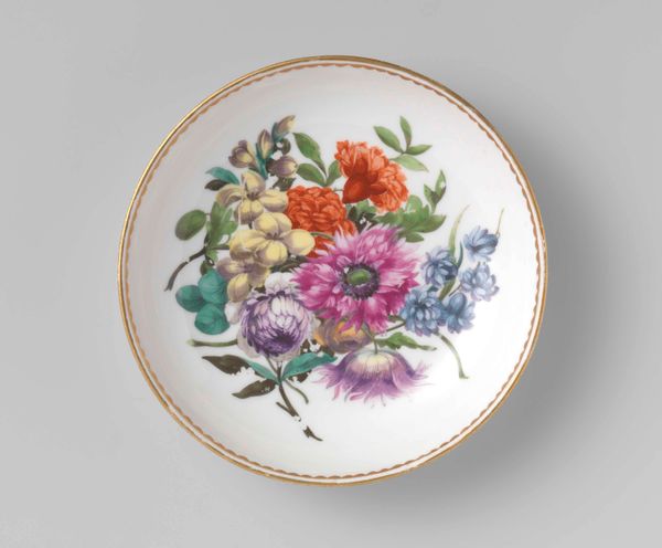 This delicately crafted porcelain saucer was made by Loosdrecht, and is part of a tea service for two. The eye is immediately drawn to the bouquet of flowers which creates a vibrant focal point against the pristine white backdrop. The arrangement is structured yet asymmetrical, with roses, tulips, and various smaller blossoms. The color palette is soft, blending pinks and purples with touches of red and blue, creating a harmonious, gentle feel. The delicate gold rim adds a touch of refinement, framing the composition, and accentuating the overall sense of harmony. Note how the artist uses the circular form to contain this burst of nature, which might be seen as a reflection of the controlled elegance that was favored during the period. In essence, this porcelain saucer embodies an aesthetic dialogue between naturalism and artifice.