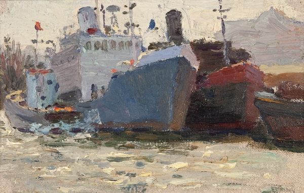 Editor: This oil painting, titled "Boats in Port Collioure," is credited to Henri Martin and gives off a tranquil, Impressionistic vibe, almost like looking at a dream of a Mediterranean harbor. How would you interpret this work through a more critical lens? Curator: I see it as more than just a tranquil landscape. Consider the historical context: harbors were hubs of commerce and connection, but also points of departure and forced migration. These boats, rendered in the soft strokes of Impressionism, can be read as symbols of mobility and potential displacement. What narratives of power and inequality might be hiding beneath this picturesque scene? Editor: So, you're suggesting that even in a seemingly idyllic painting like this, we can find traces of social and political realities? Curator: Exactly! Think about who owns these boats, who benefits from the trade they facilitate, and who is excluded. Who labored to build them? The Impressionists, while often celebrated for their aesthetic innovations, were also depicting a rapidly changing society. Their artistic choices, like focusing on leisure and landscapes, sometimes masked the underlying tensions of the era. Can we consider what these boats symbolize in connection to gender or racial issues, for example? Editor: That's a fascinating perspective! I hadn’t considered the social dynamics embedded within what seemed like a simple, pretty scene. Curator: It requires us to dig deeper, beyond the surface. Art isn't created in a vacuum, but it always speaks to a specific moment, even if the message is subtle or contradictory. By understanding art's historical, intersectional roots and social role, we gain a far greater appreciation of our own biases and perspectives. Editor: This has completely changed how I'll look at Impressionist paintings from now on. Curator: Good. The goal is to make one uncomfortable about the things you learned; art must challenge us to keep interrogating these traditional works and find the social themes embedded within!
