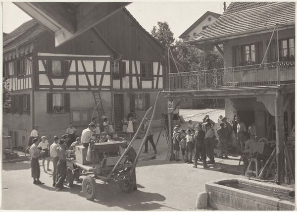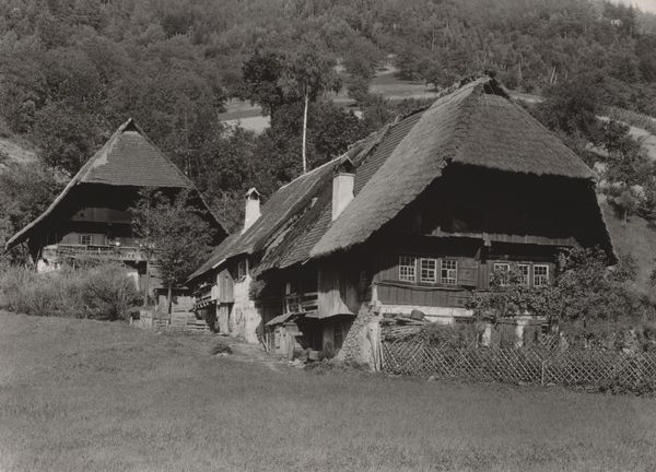 Alfred Stieglitz made this photograph, A Gutach Meeting, with gelatin silver. I love this, the gelatin silver gives it a dreamlike quality. It's not just about capturing a scene, but about evoking a mood. I notice the way the light filters through the trees, creating these soft, diffused shadows that dance across the buildings and figures. It’s almost like a painting, where Stieglitz is carefully layering tones to create depth and atmosphere. Look closely at the figures gathered near the center. They’re not just standing there; there’s a sense of connection, a shared moment. The texture of the thatched roofs is so tactile, you can almost feel the rough, organic material. Stieglitz, with his sharp focus on form and light, reminds me of some of the European painters of his time, like Gerhard Richter, who are doing interesting things with photography and blur. What do you think?