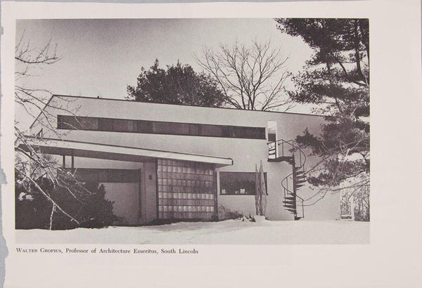 Curator: This photograph by Paul Davis shows the Gropius Residence, built in Lincoln, Massachusetts, in 1938. Editor: It feels so austere, almost unsettling. The geometric precision against the bare trees creates a stark contrast. Curator: Absolutely, it’s a deliberate statement. Gropius brought Bauhaus principles to America, and this house became a model for modern living. It challenges traditional notions of domesticity, doesn’t it? Editor: It does. And seeing it documented in this photograph, knowing its role in disseminating those Bauhaus ideas, it feels like a very powerful assertion of a new architectural vision. Curator: It really is. I think what I'm taking away is the way architecture is influenced and shapes our interactions with the physical world, and our own identities, too. Editor: Yes, and for me, seeing this photograph has made me think about the role of photography in promoting certain visions of architecture that serve as both homes and statements.