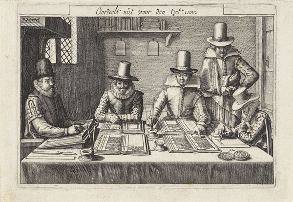 This print, made in Amsterdam in 1680 by Pieter Serwouters, depicts accountants at work. It speaks to the rise of a merchant class in the Dutch Golden Age and the institutions that supported it. The image shows five men around a table, diligently recording transactions in ledgers. Above them, the text proclaims the virtues of "Italian bookkeeping," a method then seen as modern and efficient. Amsterdam was a major center of trade and finance, and skills like accounting were vital for its economic success. This print, published by a bookseller, would have served as an advertisement for accounting manuals, and perhaps even for accounting services. What interests me most is how this image reflects the values of a society that was rapidly transforming due to global trade and burgeoning financial institutions. To understand this print fully, one might research the history of accounting, Dutch trade in the 17th century, and the role of printed images in shaping public perception. Art provides us with a window into the social and institutional conditions of its time.