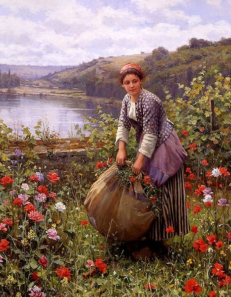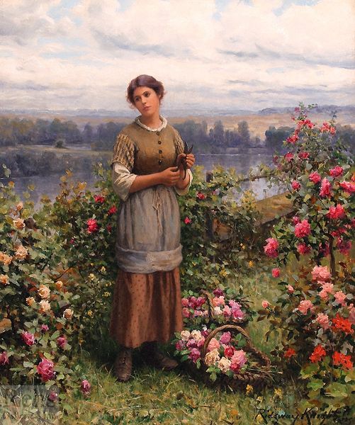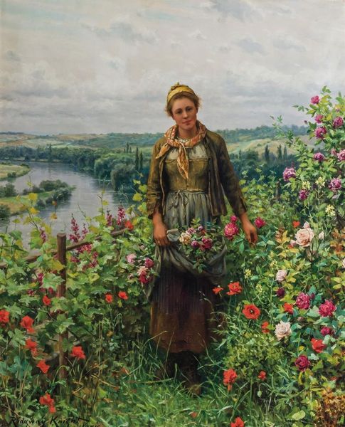 Curator: Daniel Ridgway Knight's 1895 oil on canvas, “Maria on the Terrace Rolleboise,” captures a figure overlooking a vast landscape. There’s a sense of serenity in the air, wouldn't you agree? Editor: Absolutely. The soft, diffused light creates a palpable atmosphere, almost dreamlike. And the solitary figure… there’s a melancholic beauty, perhaps a reflection on the quiet dignity of rural life and labor? Curator: The artist certainly romanticizes labor here. Given Knight’s academic training and the rise of naturalism, the setting must be seen within evolving class structures and artistic preferences. How does this representation of a woman resonate considering societal roles and expectations of the period? Editor: I see recurring motifs of connection in this portrayal. The river, of course, evokes notions of the passage of time, a classic symbol of change and continuity. Even the flowers are emblems—bursts of autumn blooms that seem to reflect the transient nature of beauty, tinged with poignant associations with melancholy and reflection. Curator: Knight clearly engaged with the prevailing interest in plein air painting, situating women as subjects, specifically peasant women, in direct contact with nature. Her averted gaze could invite discussions around both autonomy and prescribed roles. Editor: Right, and this moment, poised on the terrace… the space could be considered symbolic too. A meeting place between cultivated land and the expansive, untouched natural world beyond? The colors also echo certain values—her dress tones with the soil, tying her literally and figuratively to the land. Curator: And the river, a pathway to larger social systems that this community is, in many ways, outside of. She stands on the periphery, and is an intersection point between rural life and something larger that always remains slightly out of view. Editor: Beautifully observed. Looking at the woman again, and noticing her contemplative posture... I keep coming back to that introspective air. Even with that faint sunset, there is that melancholy… But, looking back to the broader scope of the artwork—all the layers in its cultural narratives and iconographies… What a beautiful window into its world. Curator: Agreed. "Maria on the Terrace Rolleboise" leaves us with a fascinating snapshot—a place between worlds and an individual caught within both the simplicity and complexities of her time.