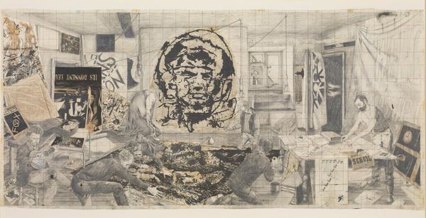 Curator: Art & Language’s large-scale work, "Index: The Studio at 3 Wesley Place, in the Dark (VI), Showing the Position of ‘Embarrassments’ in (IV)," presents a compelling visual puzzle. Editor: Yes, and a rather unsettling one, I must say. The stark black shapes against that gridded background create a feeling of claustrophobia. Curator: The grid serves as a structural framework, while the dark shapes disrupt any sense of spatial coherence. Note the various superimposed images. Editor: These images, overlaid and obscured, evoke a sense of memory and layered experience. The human figures, the architectural forms... Do you think they represent the artists' internal struggles? Curator: Perhaps. One can consider the formal elements as the work's primary content. The relationships between shape, line, and the grid define the viewing experience. Editor: But surely the "embarrassments" mentioned in the title hint at deeper psychological themes. I sense a confrontation with past failures, or anxieties about representation. Curator: A valid reading. Ultimately, this work reveals the complex interplay between form and content. Editor: Indeed. It’s a reminder that art can be both intellectually stimulating and emotionally resonant.