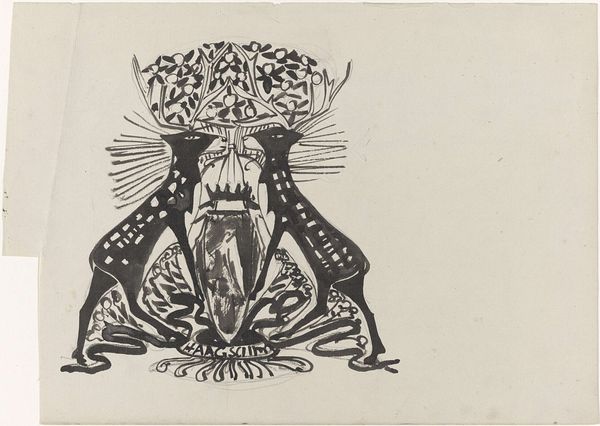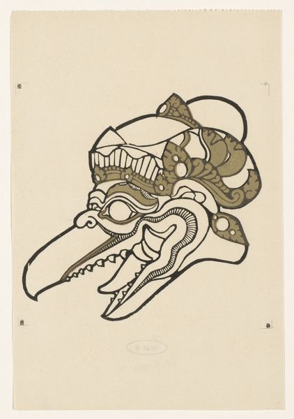 Curator: Here at the Rijksmuseum, we have a drawing entitled “Kop van een wajangpop,” or “Head of a Wayang Puppet” made before 1942. It's an ink drawing on paper. What strikes you first about it? Editor: Its stylization. It reminds me of comic strips but it seems culturally significant. What can you tell me about wayang? Curator: Wayang is a traditional form of puppet shadow play found in Indonesia. This head would have been part of a larger puppet used to tell stories from Hindu epics. Editor: So this is more than just a drawing, it's actually documenting a piece of living performance culture, capturing the design and aesthetic of a puppet character. How were these puppets typically viewed and utilized in their original cultural context? Curator: These puppets were often made of leather and elaborately painted. They were used in performances that could last for hours, often conveying moral and religious teachings. Editor: It makes me think about the politics inherent in cultural transmission and performance. What messages were being conveyed through these figures and the stories they enacted, and who had the power to shape those narratives? Was it purely educational and entertaining? Curator: Not always; the shadow puppet theatre played a key role during Indonesian independence. It was a safe way to allude to political unrest and colonial trauma. Editor: It is such a wonderful and important symbol for both cultural preservation, resistance and social commentaries that must be understood. Do you believe contemporary artists continue to see them this way, with the same purpose? Curator: Many artists indeed find wayang to be both inspiring and important. It still plays a relevant and ever changing role in cultural representation. Editor: A brief but powerful glance into an art form steeped in social significance! Curator: Indeed, a compelling reminder of art’s multifaceted roles.