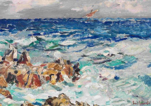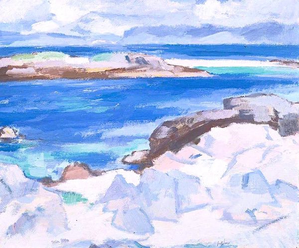 Curator: Ah, "Rocks at Barra" by Samuel Peploe, painted in 1903. It’s oil on canvas, a smaller piece, capturing a quick impression, I think. Editor: It's a symphony in blue! I feel immediately calmed but also invigorated, you know, like standing right at the water's edge. Those brushstrokes are so alive! Curator: Indeed, Peploe was deeply influenced by Impressionism. Look at the way he builds form with short, thick strokes, the colours are divided yet cohesive. Barra is one of the Outer Hebrides islands of Scotland, quite remote. This painting is very much about light, the transience of the scene. Editor: Light and also perhaps about something more enduring. The rocks in the foreground provide such solid presence, anchoring that volatile water. There is, throughout art history, the recurring motif of water as a symbol for cleansing and rebirth. I can’t help but feel it when seeing water depicted like this. What are the rocks saying? Stability? Resilience? Curator: Or just the raw, rugged beauty of Scotland! Don’t forget, he was part of the Scottish Colourists group. Colour and light was primary. His approach was somewhat radical for Scottish art at the time. This interest, though, would endure and influence younger artists going forward. It’s as if, even amidst that churning water, there’s a stillness he's trying to capture. Editor: The "spirit of the place," as they say. I love how those whites in the waves create little flashes of intensity – like the crests are almost leaping off the canvas. The cool palette contrasts the energy on display, as if capturing something primal and constant through it all. I also note Peploe’s use of complementary colours for the rocks: dark blues, violets, even browns that pull your eye toward the composition and toward stability, while allowing your imagination to fly across those vibrant sea blues. Curator: Exactly. A reminder of the power, the relentless force and appeal of nature – that tension between the still, immovable rocks and the transient motion of the waves. And Peploe communicates it so economically! It invites contemplation, and a sigh. Editor: Absolutely, it invites you to think about what survives—endures through relentless cycles, as all those crests continue, one after another.