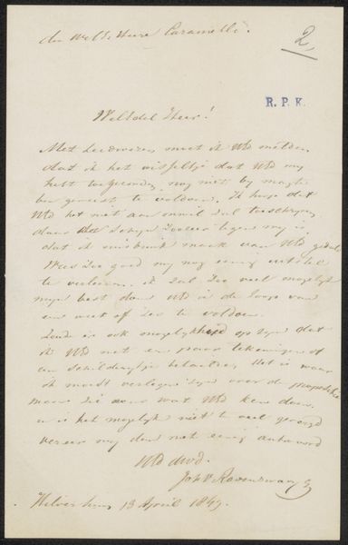 This letter was written with ink on paper by Samuel Johannes van den Bergh in 1862. Van den Bergh was part of the Dutch bourgeois class who participated in a vibrant letter-writing culture. During this period, the postal service was becoming more efficient and affordable, enabling people to maintain relationships and conduct business over long distances. Letters were more than just functional; they were performative acts that reinforced social bonds. The formal handwriting, polite address, and carefully chosen words reflect the social expectations of the time. The act of writing and receiving letters contributed to a sense of community and shared cultural values. Historians interested in the social conditions of the 19th century Netherlands can consult archives of personal correspondence to understand the dynamics of daily life, social class, and the role of communication in shaping cultural norms.