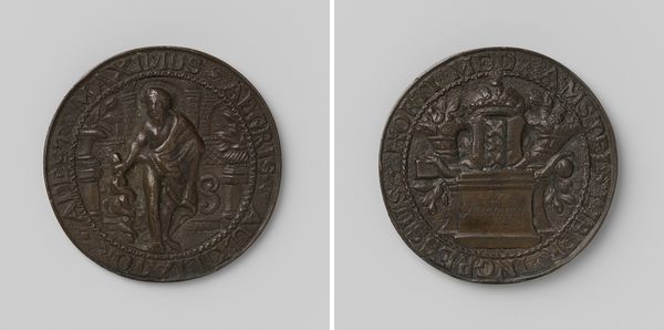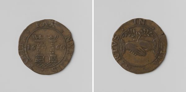 Editor: This is a metal "rekenpenning" or reckoning penny, titled "Hope for peace in Gelderland", made in 1607. It’s anonymous and housed in the Rijksmuseum. It’s a small, unassuming object, but the relief sculpture has a weighty, almost baroque feel. What stands out to you about this piece? Curator: I’m drawn to its materiality, its explicit function tied to calculation and control by the Chamber of Gelderland, but also its subtle narrative. The material itself, likely bronze or copper, speaks to the accessibility and intended circulation of this object. Coins were about use, circulation, production. The images of peace – the olive branch and cherubs – versus the instruments of war – the arms of Gelderland – is a visual tension reflecting its production during wartime. What kind of labor went into its production and eventual uses? How does it shape relationships of its user within society? Editor: That's fascinating. I hadn't considered the bronze or copper as suggestive of its intended circulation within specific social strata. Curator: Exactly. Consider the minting process itself. Craftsmanship, skill, and time investment transformed the raw materials. Look at the design and ask ourselves how these visual components are being mass produced and how these efforts speak to their time. What processes led to it and how did that production interact within contemporary culture? Editor: So, it’s not just an art object; it’s evidence of production and labor, communicating ideas about peace and power via very particular material means and a specific context. Curator: Precisely. The physical object becomes a lens through which we examine economic and social relations of the period. An understanding of these relations might explain why, during the conflict-ridden early 17th century, people may desire peace and express it in a useful tool for calculating public funds. Editor: This makes me look at this piece in a new light. Thank you! Curator: My pleasure.