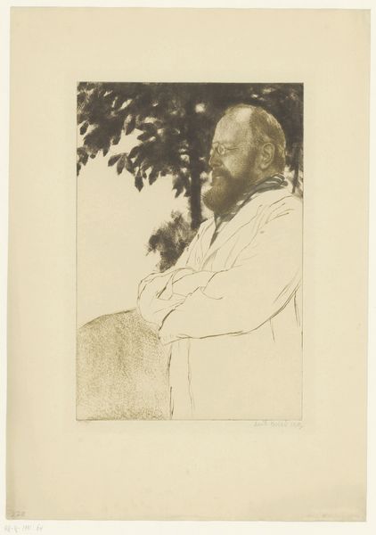 Curator: Emil Orlik created this portrait of Leopold von Kalckreuth in 1902, utilizing an etching technique. What strikes you first about it? Editor: The muted tones create such a contemplative mood. I find myself wondering what he's pondering, gazing off into the distance. Curator: The deliberate use of etching allows for that fine detail. The lines almost feel like a drawing, giving it an intimate quality despite being a print. It’s interesting to consider the role of printmaking in democratizing portraiture at the time. Editor: Absolutely. And consider the impact this had on fostering artistic communities, circulating images, and building reputations. Curator: Precisely. The reproduction facilitated by printmaking allowed for the widespread dissemination of both Orlik's and von Kalckreuth's images and influence. Editor: Seeing this now, I am thinking about the institutional contexts, how these portraits circulate and what narratives about artists get created and sustained through that. Curator: A thoughtful observation. It brings attention to the materials and processes that shape artistic legacies. Editor: Exactly. It makes me appreciate the layered meanings embedded in this seemingly simple portrait.