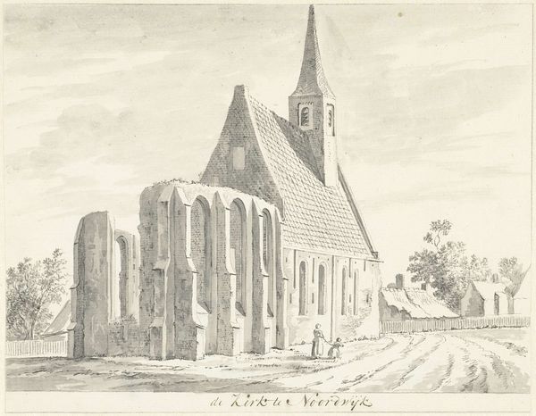 Curator: This drawing, “Kerk te Warmond en de ruïne daarvan,” by Hendrik Tavenier, completed in 1783, depicts a church and its ruins with delicate lines of pencil and ink. What are your first impressions? Editor: I’m immediately struck by the contrast between the solid, standing structure on the right, with its intact roof, and the skeletal remains of the tower on the left. It’s as though time itself is visibly eroding faith. Curator: Indeed, Tavenier masterfully employs light and shadow to emphasize the distinction. Note how the intact portion is shaded with closely placed parallel strokes, giving it volume, while the ruined area is suggested with lighter, broken lines. The steeple of the church looms above like an aspiration, but below its base crumbles, it cannot hold firm forever. Editor: Churches as containers of cultural memory were powerful symbols in the late 18th century; their architecture conveyed a tangible link with historical narrative. To see one depicted in partial ruin speaks to an era grappling with loss. Is this a commentary on the crumbling of religious or perhaps social structures? Curator: It certainly hints at that possibility, but also represents shifts in art and cultural value in the face of Neoclassicism, which looked back to a perhaps idealised moment, but whose architectural sketches and landscapes depicted a certain present moment—which in turn would be superseded, abandoned. Editor: It makes me think of memento mori paintings—skulls and withered flowers—reminding us of mortality. Here, stone and mortar serve the same purpose. Yet, Tavenier hasn't just captured decay, but has imbued this image with a kind of serene beauty; the marks of hand making show the viewer something solid but only provisional. Curator: Agreed. The composition guides the eye vertically—the gaze begins at the base and moves up towards the towering steeple, then dissipates into the wispy sky. The perspective subtly invites the viewer into a silent contemplation on enduring history. Editor: It feels strangely complete as it is. I am intrigued by this idea of capturing things which may only endure for a time—this provisional feeling feels vital. Curator: Perhaps that fleeting sensation is Tavenier's quiet success with this piece, making this humble image into something potent and worthy of prolonged consideration.
