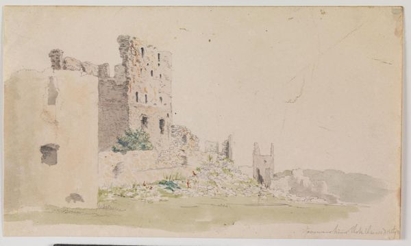 Curator: "Conway Castle," a watercolor on paper completed around 1802 by Cornelius Varley, offers a glimpse into the artist's landscape sensibilities. Editor: Oh, it’s dreamy! Like a faded photograph clinging to a memory. It feels both serene and vaguely melancholic, don’t you think? The grayness is a bit heavy. Curator: Gray definitely dominates. It speaks of the sublime, doesn't it? The lone tower against the watery expanse. This subdued palette, almost monochromatic, draws heavily on the romantic era where ruins symbolize the passage of time, the transience of human endeavors against nature’s persistence. Notice how the architectural solidity contrasts the almost vaporous sky. Editor: The way he's handled the light, too—it feels diffuse, almost otherworldly. I get a strong feeling of quiet contemplation, standing there by the water’s edge. It makes you wonder what Varley was feeling as he sketched this. Maybe a bit lonely? Curator: Quite possibly. Conway Castle itself holds complex cultural significance, initially erected by Edward I during his conquest of Wales. It embodies power, subjugation, and ultimately, the shifting tides of history. Varley likely knew this, and I suspect this awareness informed his choice to portray it this way. He perhaps reflects on themes of British identity or on colonialism's imprint upon the land itself. Editor: See, that just adds another layer to the melancholy! All that history just weighing down on the stones. I initially just saw a pretty picture, but it’s definitely deeper than that. Funny how a simple landscape can do that, isn’t it? Whisper stories from the past. Curator: Indeed. A picture might be worth a thousand words, but here, the colors also carry their weight in historical and emotional texture. The symbol becomes a portal, where watercolor blurs the boundaries between what we observe, what we remember, and what a place continues to mean. Editor: So, the next time I feel blue, maybe I should seek out some picturesque ruins? It certainly provides some perspective, thinking about how everyone leaves ruins for the next culture and civilization. Thanks, Varley.