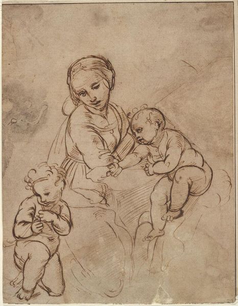 Editor: This is "Study for an Infant Christ," by the School of Raphael. It's a small drawing, about 4x3 inches, at the Harvard Art Museums. It's lightly sketched, but so full of life! What strikes you about this piece? Curator: It's a whisper of a drawing, isn't it? Like a fleeting thought captured on paper. To me, it's about the potential, the "Christ-ness" waiting to bloom within this chubby infant. Do you see how the artist focused on the face and hands? Editor: I noticed the hands. They seem almost… knowing. Curator: Exactly! It's as if the artist is hinting at the future, the weight of destiny held in those tiny palms. Maybe they knew what was waiting in the verso of the drawing. Editor: That's beautiful! I hadn't thought of it that way. Thanks for pointing that out!