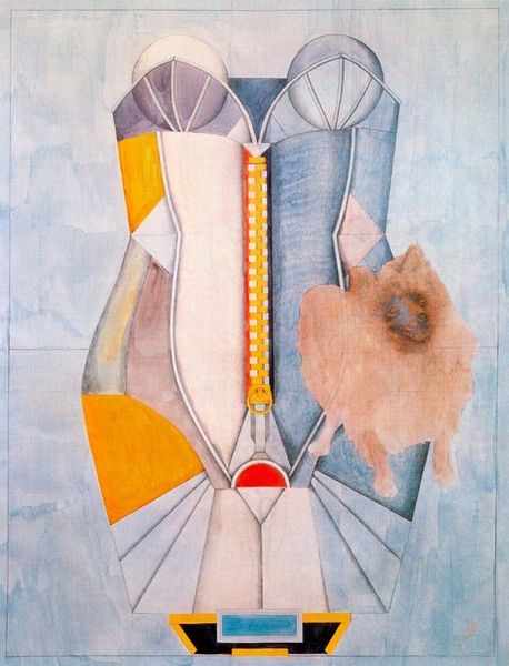 Editor: So this is Ashley Bickerton’s “The Patron” from 1997. It’s made with oil and acrylic paint. It’s quite… jarring. It feels like a critique of wealth and privilege. How do you interpret this work? Curator: The "jarring" quality is precisely where the potency lies, isn't it? The figure, clearly meant to evoke power, is juxtaposed with symbols of both high and low culture, creating a dissonance that resonates. Do you see the significance of the trophy, Mondrian-like artwork, and the animal form at the bottom? Editor: The trophy could represent success and status, and the Mondrian piece screams 'high art', I guess. The animal… not so sure. It seems almost feral and grotesque compared to the other objects. Curator: Precisely! The feral creature lurking below serves as a psychological counterpoint. Perhaps it represents the uncivilized id lurking beneath the surface of refined society, a sort of Jungian shadow figure. It brings to question how cultural memory shapes our understanding of power and wealth. Does this resonate with your impression of the figure itself? Editor: Yes, it does. The figure itself seems deflated, not powerful. Maybe the artist is implying that wealth is a kind of performance, hiding something less refined underneath. Curator: Excellent observation. Bickerton seems to be pulling at threads connecting personal psychology and cultural symbols, exposing the raw elements beneath carefully constructed images. It invites the audience to contemplate these layered, symbolic meanings we’ve inherited. Editor: That's fascinating. I came in thinking this was simply an attack on wealth, but seeing the different layers of symbols makes it a lot more nuanced. Curator: It is about more than money. Through his symbolic layering, Bickerton asks us to question our own roles in perpetuating or challenging these images, doesn't he?