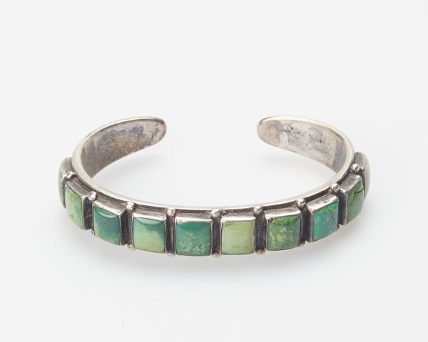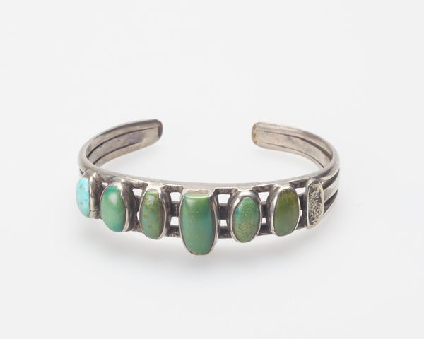 This bracelet was created by a Navajo (Diné) artist, and it is currently held in the collection of the Minneapolis Institute of Art. The bracelet's presence speaks to the complex history of Native American art, particularly in relation to cultural exchange and economic pressures. Jewelry making became a significant source of income for the Navajo in the late 19th century, a period marked by immense cultural disruption and forced assimilation. Pieces like this bracelet, crafted from silver and turquoise, were often made for trade or sale to non-Native populations. The bracelet also embodies the intersection of cultural identity and artistic expression, as the turquoise holds deep cultural significance, representing beauty, protection, and connection to the land. By adapting traditional motifs and materials to new forms and markets, the Navajo simultaneously preserved their cultural heritage and navigated the challenges of colonialism. This bracelet, therefore, serves as a poignant reminder of the resilience, adaptation, and enduring creativity of the Navajo people.