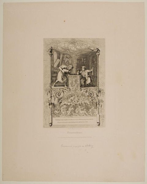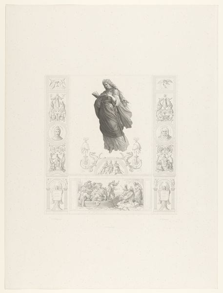 Curator: This artwork, attributed to Gustav Seidel, is entitled "Religieuze allegorie," and judging by the style and paper, was likely created sometime between 1829 and 1901. It’s an etching, a print on paper employing a line technique. Editor: It’s strikingly ethereal! The figures almost float on the page. The grayscale emphasizes the delicacy of the forms, like a memory fading into the past. Curator: Exactly! The artist presents a symbolic panorama using imagery rife with allegorical weight. Observe the figure at the apex, seemingly ascending with the help of angels, a scene echoed in miniature in the pediment-like area. The bottom section displays what appears to be some sort of royal or religious procession. Editor: And there's that very restrained color palette. The lack of color almost amplifies the solemnity, like a historical document recording events of great cultural consequence. What social context might have shaped this piece, do you think? Curator: Given its probable timeframe, it likely reflects the renewed interest in historical and religious themes prevalent in 19th-century European art, especially within academic circles eager to showcase grand narratives of history and belief. Its symbolism might be specific to certain religious doctrines that were very contested and debated at the time. Editor: Yes, that academic sensibility really shines through! The work has that almost neoclassical composure—the balanced arrangement, the idealized human forms. It almost feels like a conscious echo of past artistic styles in the service of defining the religious climate of that era. Curator: Agreed. Each element is carefully constructed to represent higher concepts, prompting viewers to consider the relationship between temporal and spiritual power through these very specific symbolic shorthands of its time. The arrangement and symbols almost act as memory triggers for historical reflection. Editor: I leave contemplating how institutions – be they religious, political, or artistic – use imagery to shape belief, to cultivate a cultural memory. And Seidel’s work seems so indicative of that practice! Curator: For me, it's fascinating to unravel these visual emblems, realizing how artists embed culturally loaded concepts within their artwork that carry echoes across generations. These aren’t just pretty pictures.