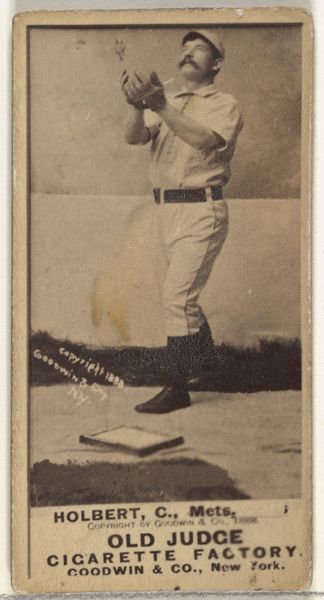 This is "John 'Jocko' Milligan, Catcher, Philadelphia," a photograph made into a baseball card by Goodwin & Company for Old Judge Cigarettes, around 1888. Consider the context: baseball was becoming America's pastime, and mass-produced images circulated widely. Cigarette companies were quick to capitalize, inserting cards like this into packs to boost sales. It’s an early example of celebrity endorsement and the commercialization of sports. The image presents Milligan in action, but it's carefully posed, presenting an idealized version of the sport. The card isn't just about baseball; it reflects the social and economic forces at play. It speaks to the rise of consumer culture and the ways in which companies sought to associate themselves with popular figures and activities. To understand this image fully, one might look at the history of baseball, the rise of advertising, and the social impact of tobacco companies. Art like this reminds us that images are never neutral; they are products of their time, shaped by social, cultural, and economic forces.
