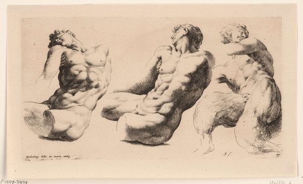 Curator: Here we have Willem Panneels' "Two Anatomical Studies of a Man Leaning to the Left, and Another Seen from Behind with Raised Arm (écorché)," dating from 1628 to 1630. I find the rawness immediately striking. Editor: Absolutely, the sheer emphasis on muscle and sinew – it's almost unsettling. One could nearly count the individual fibers; how utterly detached and academic. Curator: Academic, yes, but I wonder if detached is quite right. It is certainly a study of form and how it works – a nude that lays bare a perspective for medical purposes; yet there's something profoundly human and vulnerable exposed in the rendering of such a work. Perhaps there is more on display here that simple flesh? Editor: Perhaps you're giving Panneels too much credit in the expression stakes. Consider what drawing meant in his circles and his socio-economic background. Anatomical drawings like this, likely done with chalk and graphite on paper, were valuable tools. A commodity produced for pedagogical consumption, sold or circulated within the workshops and academies. And he probably completed the anatomical study to get new assignments within artistic circles... Curator: True. These “écorché,” flayed figures, were crucial aids for artists learning to represent the human form, enabling accurate depictions even when clothed. It allowed one to become an acute observer of our human framework. But the almost palpable tension in the figure's pose, the striving and the strain – that elevates this to something beyond mere utility, I would dare say? A study of the mind perhaps? Editor: I'll grant you there's tension but is that intentional artistry or a byproduct of observation? Every line echoes material reality and the circumstances of the era. He skillfully conveys the planes of the muscles and bone with clear, almost technical precision but this also comes across as a clinical representation, stripping away subjective depth. It is the same principle as that found when assessing a piece of labor that can also been seen with cogs. Curator: See, for me it doesn't strip away anything; it reveals. I sense a curiosity, not just to copy what's seen, but to truly understand the underlying essence. What inspires one and gives reason to breath and thrive within it. The same drive you sense from a turning cog to maintain our existence and continue to deliver results in the production world... Editor: Well, regardless of our differing takes, it is interesting to find what breathes the form and delivers different meanings into different bodies through these timeless perspectives. Curator: Indeed. And that perhaps is where the true study resides—in that constant unveiling, whether you focus on anatomy or societal structures, we are merely searching the frame for a glimpse beyond the art!