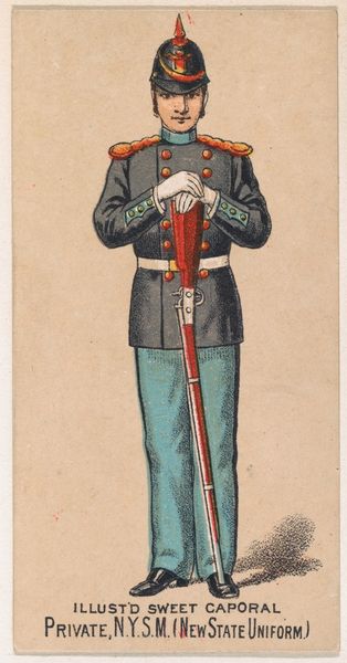This chromolithograph was produced by the Kinney Brothers Tobacco Company around 1888 as a promotional card. The officer stands in full military dress uniform, clutching a saber that signifies honor and command. Consider the feathered helmet, a curious element. It echoes ancient crests of warriors, like those adorning the helmets of Roman centurions. These plumes aren't merely decorative; they evoke a sense of authority, passed down through centuries of martial imagery. In this humble tobacco card, we see a distillation of power. The saber, the erect posture, the ornate uniform—all combine to create an image of the ideal military figure. Like the ‘Pathosformel’, these symbols and motifs reappear in different times and places, constantly changing. The gesture of holding a sword, for example, shifts from a symbol of personal combat in ancient times to one of ceremonial command, reflecting the way collective memory informs our interpretation of such images. It’s a reminder that even in the most ordinary objects, the echoes of history resonate.