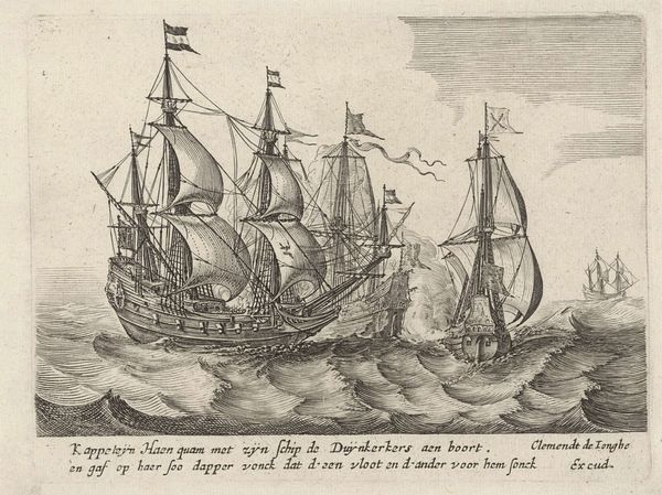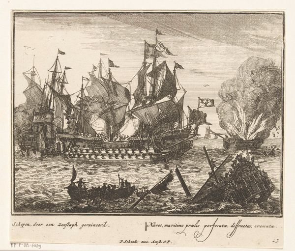 Curator: Oh, this print really takes me back to my childhood! It’s titled “Zeilende driemaster met op de achtergrond een vuurtoren en zeilschepen,” or “Sailing three-master with a lighthouse and sailing ships in the background," by Salomon Savery. It comes to us from the Dutch Golden Age, dating from around 1610 to 1665. What catches your eye? Editor: The ship looks so powerful, yet there's a vulnerability, perhaps because we see the scene only in a single hue? Curator: Precisely! Dutch maritime power wasn't just about commerce; it involved navigation, mapping, and unfortunately, participation in the transatlantic slave trade. Editor: The single-color engraving, devoid of depth, emphasizes the sea, as if the emptiness it embodies suggests a collective dread. Curator: This depiction invites questions about global economies and social justice. In an era defined by expanding trade routes, Dutch society profited from the exploitation of other cultures. Editor: So, is it that sense of "discovery" against something as grim as exploitation of resources, and sadly, of human beings. In some way it gives context to the whole picture and the Dutch Golden Age itself. Curator: Exactly. It compels us to investigate the full story and think critically about how these realities are presented through art, and whom it excludes or exploits, and, crucially, to what degree. Editor: Thinking about the relationship between sea, commerce, and what we perceive is a grim, silent image makes me realize the power of symbols—especially how our vision fills in so many blanks. Curator: Ultimately, that tension invites contemplation and, hopefully, a step towards greater equity. Thank you for your thoughts! Editor: Thank you! Thinking through a picture like this always opens my eyes in a fresh, strange, and evocative way.