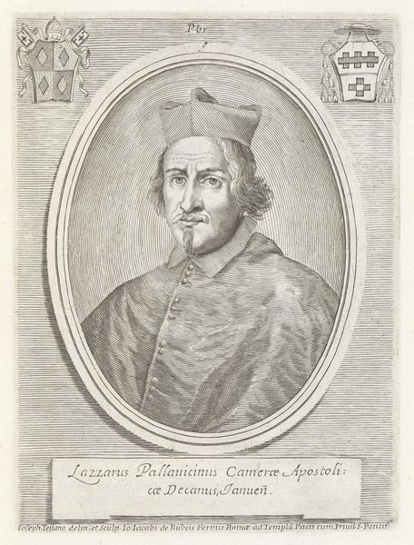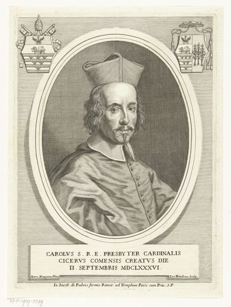 This print of Cardinal Nicolò Acciaioli was made by an anonymous artist, using the technique of engraving. Look closely at the image, and you'll notice the dominance of line, built up laboriously to suggest form and shadow. This was achieved by carefully incising the design into a metal plate, inking it, and then pressing it onto paper. The inherent qualities of the material influenced its appearance: the hardness of the metal, the delicacy of the lines, and the contrasting ink. Engraving was a highly skilled tradition, demanding precision and patience. The social significance lies in the way it democratized portraiture. Prints like this made images accessible to a wider audience, rather than just the wealthy patrons who could afford painted portraits. Considering the materials and processes involved reminds us that art is not just about the image, but also the labor, social context, and technical skill embedded within it.