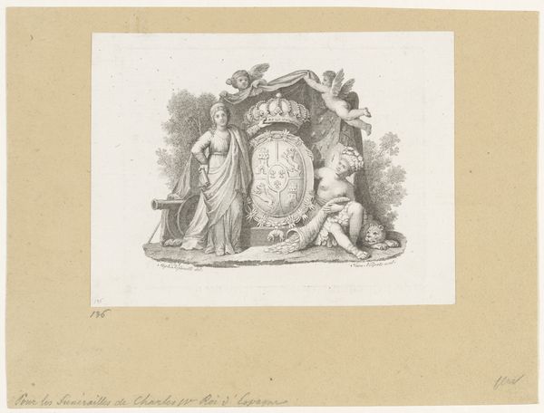 Curator: This print, dating back to 1862, is titled "Spotprent op de vereniging van de ministeries van Erediensten, Justitie en Buitenlandse Zaken, 1862," created by Johan Michaël Schmidt Crans. It’s an engraving. What's your initial take? Editor: Austere. The monochromatic palette and the stylized figure evoke a sense of classical formality, almost like an emblem on ancient currency. Curator: Absolutely. The artist's choice of engraving speaks to its function— likely intended for mass reproduction. It's a commentary on the merger of ministries: Religious Affairs, Justice, and Foreign Affairs. This unification represents a specific power dynamic in the Dutch socio-political landscape. The reference to "model of a commemorative coin" tells us that its value lies not as "art" but in what it signifies and circulates. Editor: True. Technically, look at the engraver's command of line. The figure of Justice, with her scales and the blindfold resting atop her head, has this powerful verticality, almost rigidly structural. Then we have these textural subtleties rendered by the hatching and cross-hatching giving depth to her robes, imbuing the allegorical figure with palpable weight. It all feels incredibly intentional and poised. Curator: Right, notice Justice's spear— labelled “Justitie” itself. A literal visual declaration of the tool with which justice is done! And adjacent to Justice is this strange ornamented pillar adorned with text – KERKL. REGLEMENT or, "Church Regulations," a fascinating element in its visual alignment to her. I read this union with Justice as a pointed comment on the alignment between state power and religious institutions. Editor: Yes, it feels symbolic, but rather critical. Given the date, in the mid-19th century, the themes it evokes align it with classical ideals that informed similar allegorical artworks found across Europe, specifically regarding civic order and the concept of justice. Its clean lines emphasize clarity; perhaps a commentary on these social structures. Curator: An astute point about clarity, it highlights how these ministries sought to present their actions, a claim for reason amidst inevitable social and political chaos. The making of an easily circulated and reproduced object demonstrates its usefulness within Dutch civic discourse. Editor: This has definitely helped refine my initial observation. Looking closer at Johan Michaël Schmidt Crans' rendering now, it moves beyond a static, symbolic piece. Curator: Agreed. The process by which these objects are made, who profits from the message it produces, tells us about Dutch society and its systems.