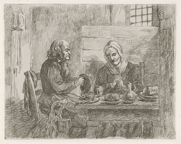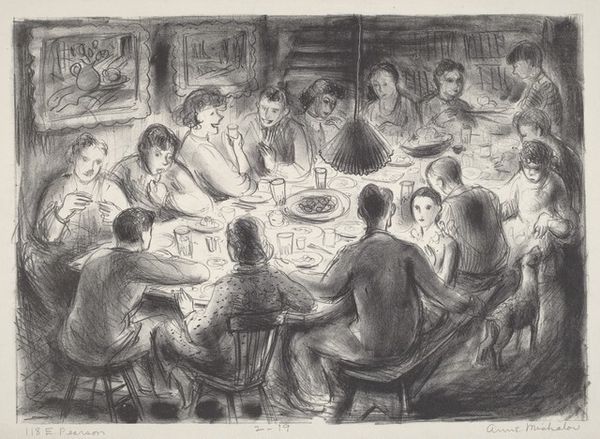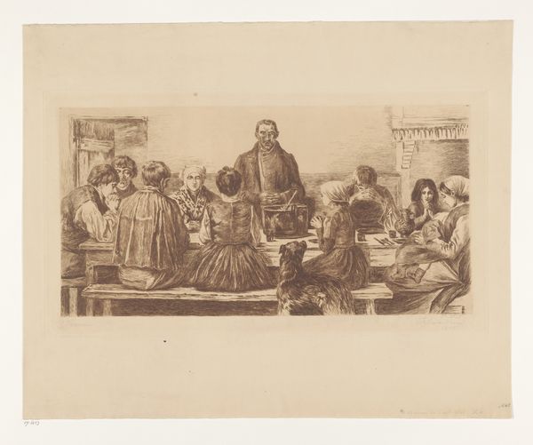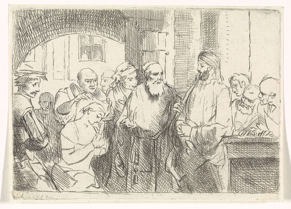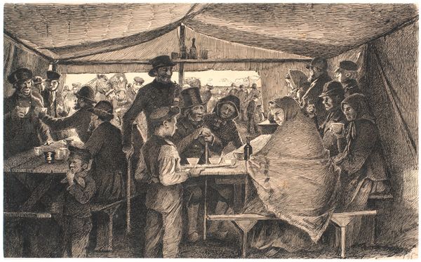 Curator: This drawing is titled "Court Scene," created by Charles Samuel Keene between 1870 and 1891. It's crafted with pen, ink, chalk, and pencil on paper, currently residing here at The Art Institute of Chicago. Editor: It gives off such a weighty atmosphere, doesn't it? The way the lines are scratched in, almost frantic—there’s a nervous energy permeating the entire scene. Like everyone is holding their breath waiting for a verdict. Curator: Indeed. Keene’s expert handling of line creates both form and mood. Notice the density of hatching to define the figures versus the economical use of line in the background, really emphasizing the central characters and directing the viewer’s eye. Editor: That cluster of faces behind the bar - a study in silent judgment. And then, in the foreground, those two robed figures... their expressions are so inscrutable! It’s as if they're acting out a preordained drama with no emotion attached. Are we supposed to know who’s good or bad here? Curator: Morality is often ambiguous in Keene’s genre scenes. He avoids didactic narratives, preferring to capture the complexity of human interaction within specific social contexts. The realism isn't about perfect likeness but an attempt to grasp something essentially human, within these inky, fragile strokes. Editor: It makes me wonder what verdict these people reached. Do you think anyone felt seen, feel judged or feel relief in this whole scenario? This drawing is really just a collection of human question marks! A real mood of anxious energy and uncertain judgement in this historical capture. Curator: That feeling of uncertainty is key. Keene presents us with a snapshot, inviting us to fill in the narrative gaps. We see not a conclusion, but a moment suspended, endlessly re-interpretable. A lot can be taken and gathered with only what Keene provided to use here for context. Editor: A scene pregnant with unspoken stories. That's the genius, isn't it? This image might just follow me home and plant itself rent free in my mind to stir and grow! Thank you, this was an eye opener.