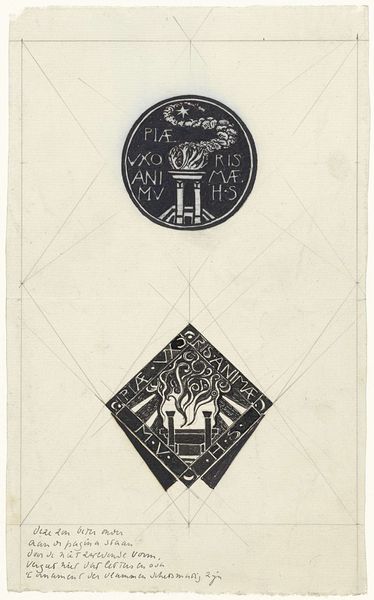 Editor: Here we have Richard Nicolaüs Roland Holst's "Ontwerp voor een vignet Piae Uxoris Animae," made sometime between 1878 and 1938, utilizing ink and pencil on paper. It looks like a study or draft, filled with geometric lines, and has this really fascinating, almost haunting emblem in the center. What’s your take on it? Curator: Well, given Holst's strong ties to socialist ideals and his role within the Dutch Arts and Crafts movement, it's hard not to see this emblem as deeply intertwined with those contexts. The text included within the diamond, the columns, and the swirling smoke above are evocative. How does this piece fit into the visual language of early 20th-century social movements, you think? Editor: It definitely feels like it’s referencing something bigger than just a personal sentiment, especially with the geometric structure almost diagrammatic. But, like what's the link with socialist movements here? Curator: Symbolism, popular within artistic circles during that era, offered a means of conveying layered ideas. Notice the use of Latin – "Piae Uxoris Animae," meaning "For the soul of a pious wife" – contrasting with the Dutch text below, hinting at both classical aspirations and local realities. The graphic nature also lends itself to reproduction, doesn't it? Making the artwork itself useful in public life? Editor: So, it's not just about private mourning but could be used for broader, maybe even political, messaging because of its visual form and language? Curator: Exactly. How images circulate, who controls them, and what stories they tell become powerful questions when considering the politics of representation. The style itself suggests a bridge between fine art and design for social impact. Editor: That's a fascinating connection I hadn't considered! Seeing it as a designed piece with the goal of broad influence makes the symbolism even more interesting. Curator: It speaks to the intersection of art and social progress. Ultimately, understanding its place within this network highlights how art served the broader socio-political dialogues.