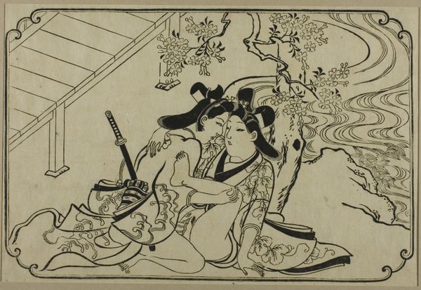 This print, "Back to Back" by Furuyama Moroshige, was created in Japan around 1690. The image presents two women in elaborately patterned kimonos seated back to back. The sword, the tea ceremony set, and other feminine items create a peaceful domestic scene, a common subject in ukiyo-e prints during the Edo period. Moroshige worked during a time of relative peace and economic growth in Japan, which led to a flourishing of arts and culture. These woodblock prints reflect the values, tastes, and lifestyles of the urban middle class. The women are most likely courtesans, who were known for their fashion, artistic talents, and social graces. Looking at their posture, there is a sense of both intimacy and distance. Their backs are touching, yet they are each lost in their thoughts. In a society governed by strict social rules, such prints offered a rare glimpse into the private lives of women. This print offers an intimate portrayal of female companionship and challenges conventional representations of women. It allows us to reflect on the multifaceted nature of identity, even within historical constraints.