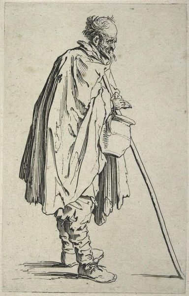 Curator: Here we have "Young Farmer with Long Pipe," a drawing by Frederick Bloemaert, made sometime after 1635. It's done in pen. What catches your eye first about this piece? Editor: It's strikingly melancholic, wouldn't you say? He seems weighed down, though the lines are clean and crisp. His gaze is cast downwards. Curator: Indeed. Bloemaert was quite skilled at capturing human emotion, often reflecting on universal experiences. The pipe, common in genre painting, is here imbued with a sense of quiet contemplation. This reflects an interesting aspect of peasant imagery becoming acceptable—even desirable—subject matter within the Dutch Golden Age, often tied with national identity. Editor: And this peasant archetype—notice how the weight of the fabric suggests an almost classical form, ennobling his bearing. I also see elements of pastoral simplicity meeting emerging capitalist culture in this choice of subject. This kind of idealized depiction definitely has a sociopolitical agenda behind it. Curator: I agree entirely. Beyond just depicting the farmer, Bloemaert evokes a certain sense of introspection, tapping into emotions connected with simple life, yet tinged with emerging realities in the Dutch Republic. He does it through minute detailing with the pen strokes giving texture to fabric folds, making you feel the weight. And while the subject seems lost in contemplation, notice how the staff seems rooted firmly to the earth beneath his feet, anchoring him to his context. Editor: A carefully placed symbol, that rooting. He looks as though he’s communing with nature while subtly reinforcing the stability of the societal structure. It seems deceptively simple on first glance, this farmer with a pipe and a staff, but then layers of the social context of the Dutch Golden Age rise from it like smoke. Curator: Precisely. This work showcases a dialogue of class, status, and individual introspection within the social theatre of the time. It reminds us that even seemingly simple subjects can unveil so much if we lend our eyes and minds to them. Editor: I agree, I leave feeling it makes us remember these rural communities and figures weren't merely passive figures on a landscape, they actively helped shape and negotiate societal values in ways we can easily overlook.