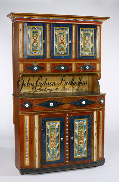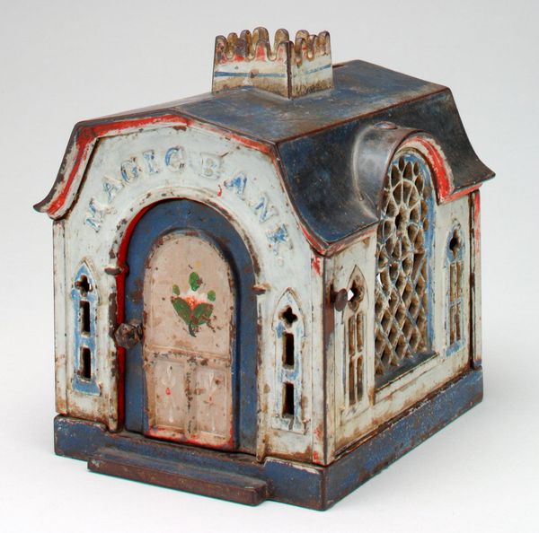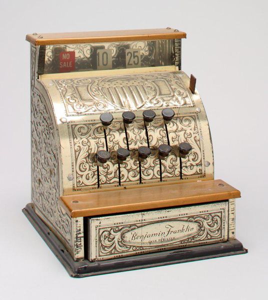 Curator: This is the Stollwerck coin-operated chocolate dispenser, dating from around the 1880s to 1890s, part of the decorative arts holdings here at the Minneapolis Institute of Art. It combines mixed-media, employing metal and glass within its Art Nouveau design. What’s your initial read? Editor: My immediate response is a bittersweet nostalgia. Its brightly colored façade tries to mask what, ultimately, is a transactional experience—a child exchanging money for a treat controlled by corporate capitalism, masked by whimsy and implied reward. Curator: Exactly. Stollwerck was a major German chocolate manufacturer, and this dispenser reflects the increasing commercialization of childhood. Notice the text, “Put one cent in the chimney and pull the handle.” It frames consumerism as a game, obscuring the very nature of capital. Editor: Right, it's all about manipulating desire. The figures represented in the illustration have always seemed deeply gendered, as though they're acting out some late 19th century social role under the auspices of buying treats. We’re talking here about children internalizing the expectations placed upon them by early advertisement. Curator: Certainly, consider how this mechanism operated within spaces such as train stations, arcades, even taverns; inserting the company literally into everyday public spaces. It becomes embedded within popular visual culture. And this Art Nouveau style? How does that function here, visually? Editor: The whiplash curves and naturalistic motifs contrast jarringly with the machinery within. It aestheticizes exploitation! The shiny metallic exterior creates an appealing sheen on what, viewed with contemporary lens, presents certain ethical problems relating to marketing and access, especially concerning young children in urban spaces. Curator: And we also mustn't overlook the very idea of such "leisure time" activities which may only have been experienced and indulged in within very specific social parameters. Editor: Precisely! A small purchase can lead to vast implications and that is what makes this such an important artefact. Thanks, I hadn’t thought of it quite like that before. Curator: The dispenser presents an interesting historical lens to see both social constructs and class barriers. Thanks, you too.