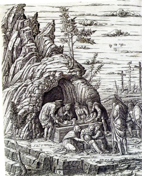 Andrea Mantegna created this engraving, The Entombment, in Italy around 1500, depicting the body of Christ being carried to his tomb. Mantegna was interested in the clarity of line and form of classical sculpture, and these interests aligned with the growing humanist movement in Italian institutions. Although a religious scene, Mantegna’s engraving suggests a world of intense emotion, with those surrounding Christ overcome with grief. Look at the clear, sharp lines and dramatic shading that give the image its emotional power. It’s worth considering how the artistic institutions of Italy influenced the art of this time. As the status of the artist grew, so did the belief that art was more than just a craft: it had the power to represent the inner lives of people. To understand this artwork, one might research Renaissance humanism, the history of art academies, and the social role of religion in 16th-century Italy. What do these sources tell us about the cultural values of this period?