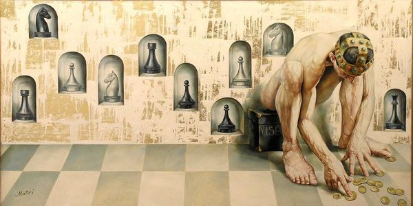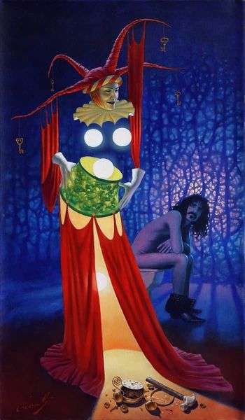 Michael Cheval painted ‘Cleopatra’ in an undated moment of his career. In his surrealist rendering of the Egyptian queen’s famous encounter with Caesar, the artist seems to want us to think about the power of myth and the artifice of history. Born in Siberia but later working in the United States, Cheval has an interesting relationship to the western canon. He engages with its traditions of history painting, but then renders them strange through surrealist juxtaposition. Look at the way that the artist places Cleopatra and her entourage against the backdrop of a stage, complete with props and curtains. Are we meant to be drawn into the drama or kept at a critical distance? It is a question of how the institutions of theatre, painting, and museums create fantasies of the past, fantasies that, even now, are contested. Studying the ancient sources and their later interpretation can help us see how much our understanding of the past is constructed. And in this way, art helps us understand our present.