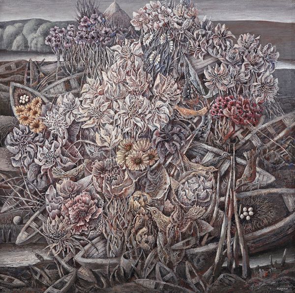 Ivan Marchuk’s painting, “Warning,” is made with oil paint in a style that seems to want to warn us about...well, maybe everything? The first thing I see is the mark making. It’s like a nervous system has been laid bare, all twitchy lines and textured surfaces. The colors are muted, almost monochromatic, which adds to the sense of unease. It’s as if he’s built the whole thing up from tiny, frantic marks. There is this part in the center that looks like faces, or maybe skulls, emerging from the chaos. The paint is so thick there, you can almost feel the weight of it. This isn’t just about depicting something; it’s about the act of painting itself, the struggle to make sense of the world through texture and line. Marchuk reminds me of Alfred Kubin, who also embraced the weird and unsettling. It feels like an urgent message, a reminder that art can be a way to confront the things that scare us.